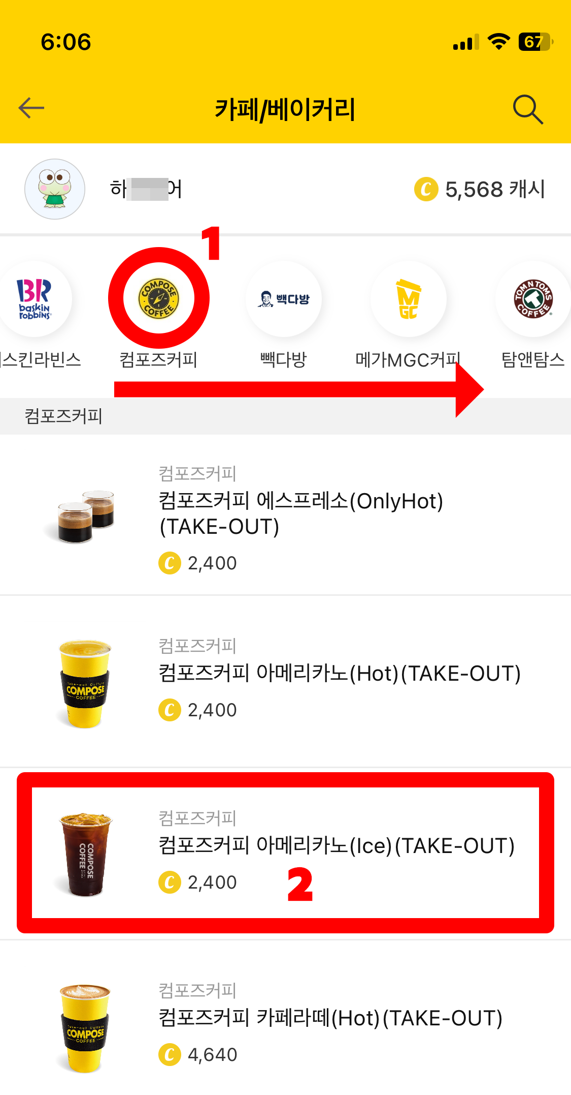 모바일 교환권은 여러 브랜드의 상품으로 교환할 수 있습니다. 브랜드 아이콘이 있는 부분을 옆으로 밀어보면 뒤쪽에 있는 브랜드도 볼 수 있는데요. 저는 그 중에 컴포즈 커피를 선택했습니다. 스타벅스나 할리스와 같은 브랜드보다 컴포즈나 메가커피와 같은 브랜드의 가격이 더 저렴해서 캐시 가격도 덜 책정되었습니다. 컴포즈커피의 아이스 아메리카노는 실제로는 1,500원인데 캐시로는 2,400캐시입니다. 저는 5568캐시를 보유하고 있었기에 이것을 교환할 수 있었습니다. 원하는 상품인 컴포즈커피 아이스 아메리카노를 클릭합니다.