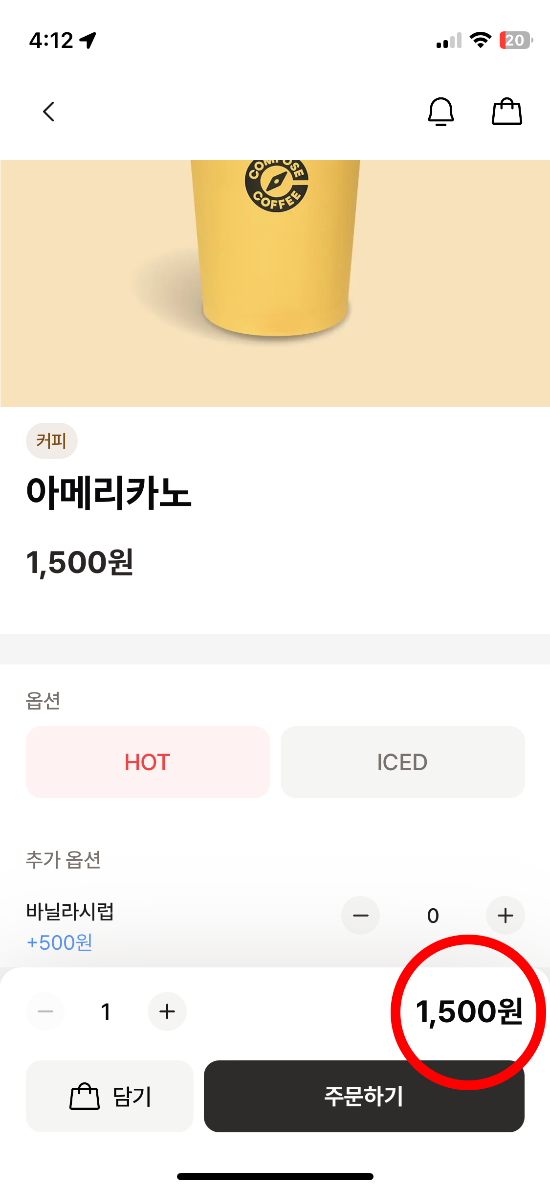 기본적으로 아이스 아메리카노 화면이 먼저 나타나지만, HOT을 클릭해 옵션을 변경하여 따뜻한 아메리카노를 주문할 수 있습니다.