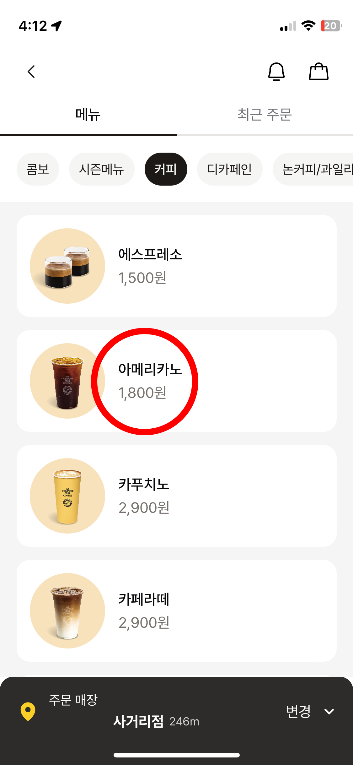 따뜻한 아메리카노를 주문하기 위해서, 아이스 아메리카노 그림으로 나타나는 아메리카노를 선택해야 합니다.
