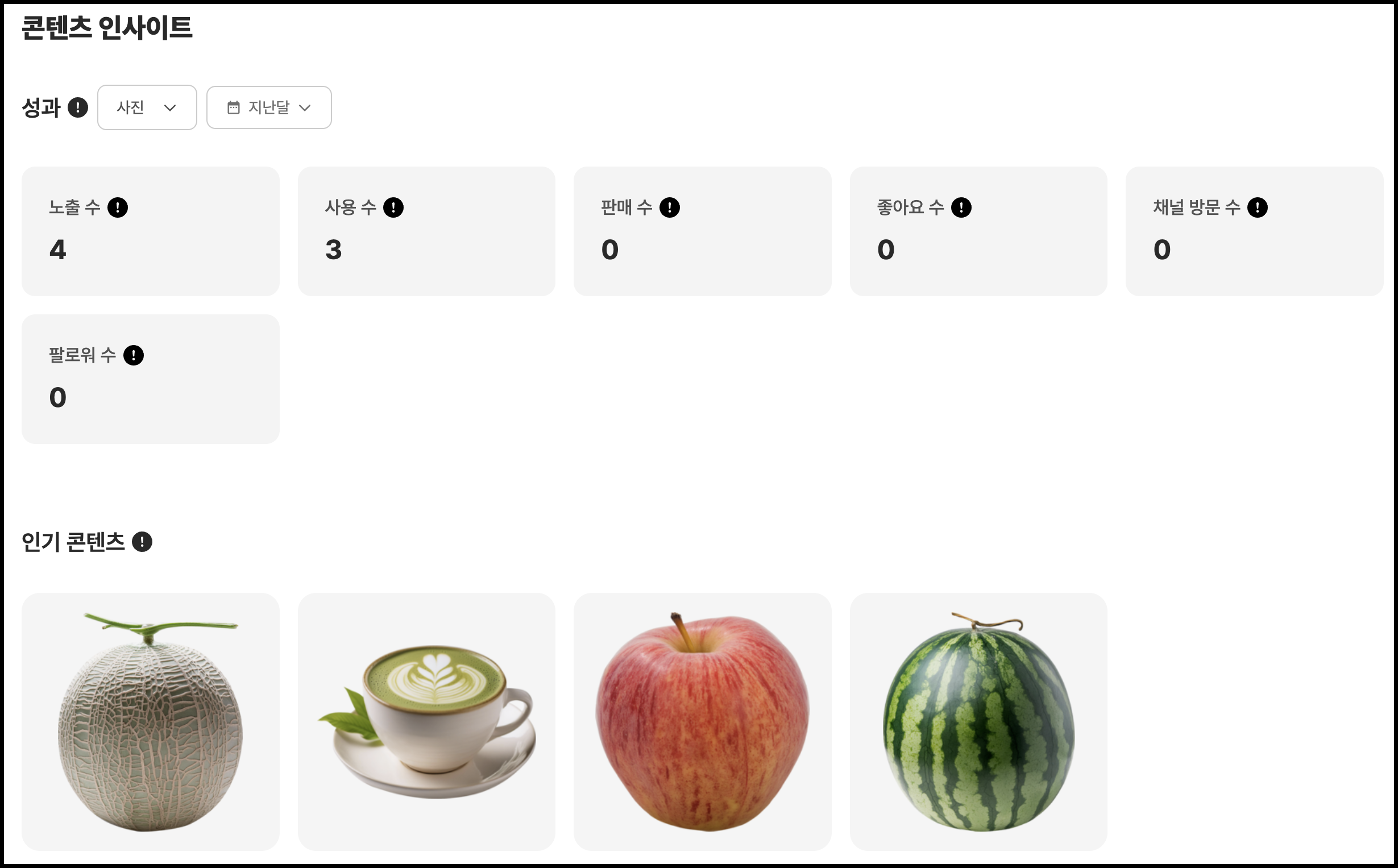 각 콘텐츠 위로 마우스 커서를 올리면 더 자세한 리포트를 확인할 수 있습니다. 확인해보니 멜론이 세 번 사용되었고 녹차라떼와 사과와 수박은 사용된 적은 없으나 콘텐츠 노출이 있었습니다. 이미지를 검색했을 때 저의 콘텐츠가 노출이 된 모양입니다. 이렇게 피드백을 확인할 수 있어서 재미있습니다.