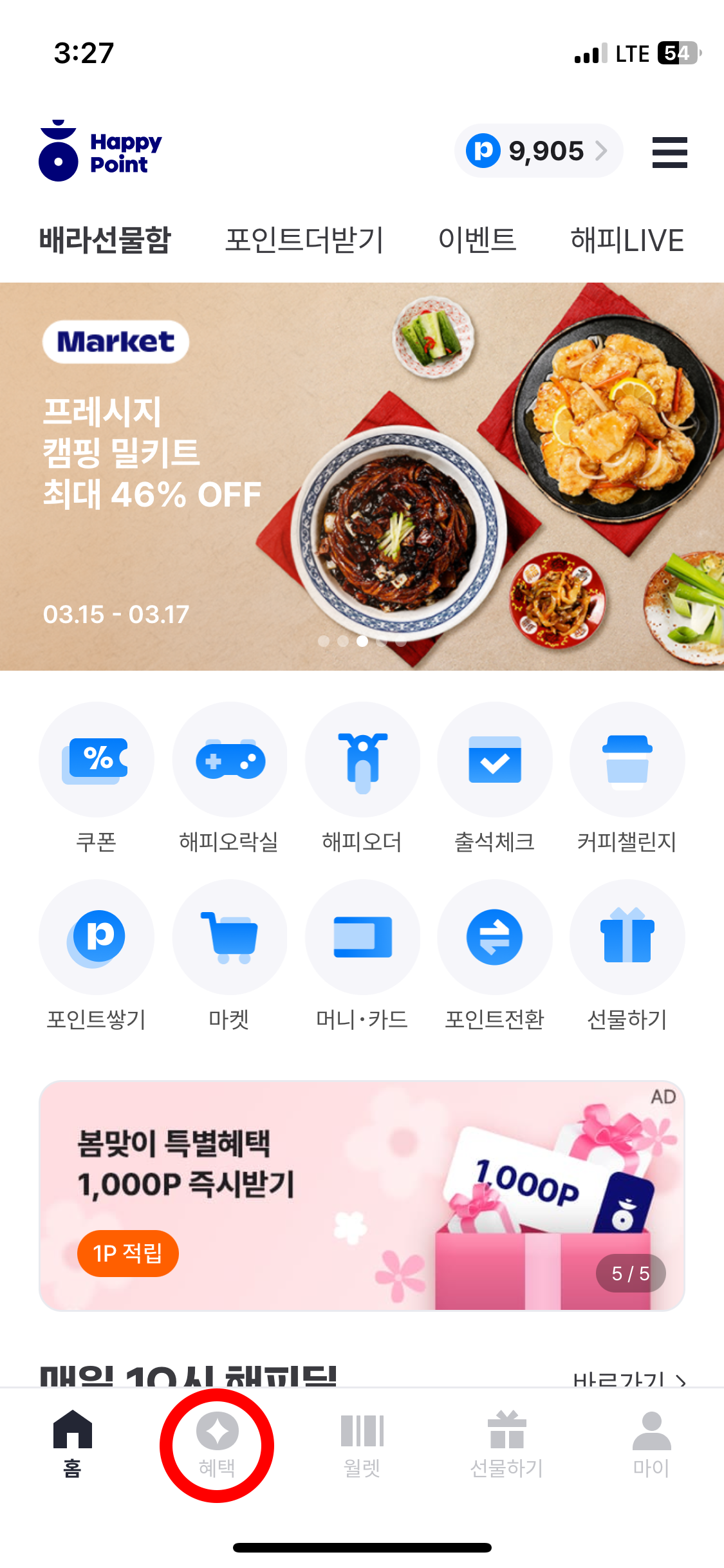 먼저 스마트폰에서 해피 포인트 앱을 엽니다.