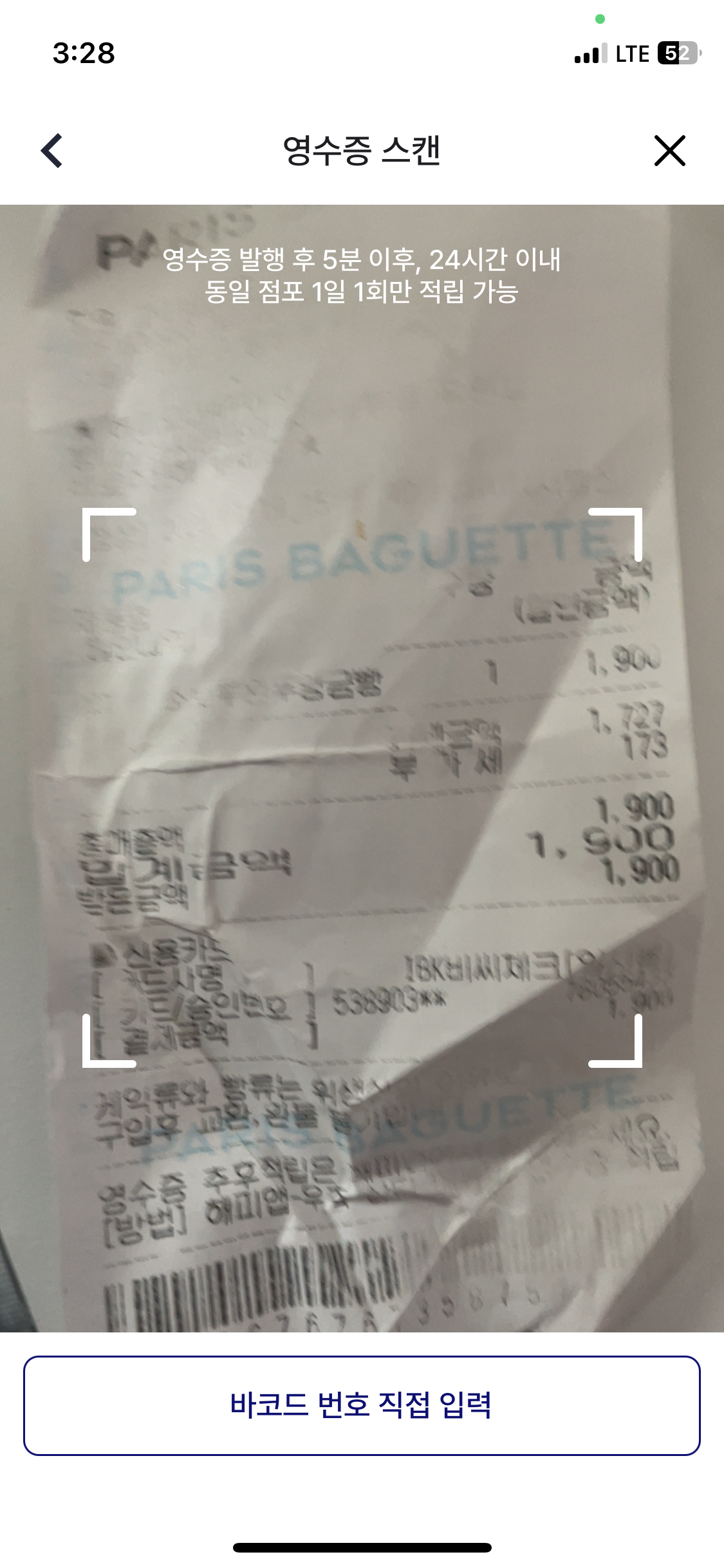 : 영수증 발행 후 5분 이후 24시간 이내에만 적립 가능하고, 동일 점포의 영수증의 경우 1일 1회만 적립 가능합니다.
