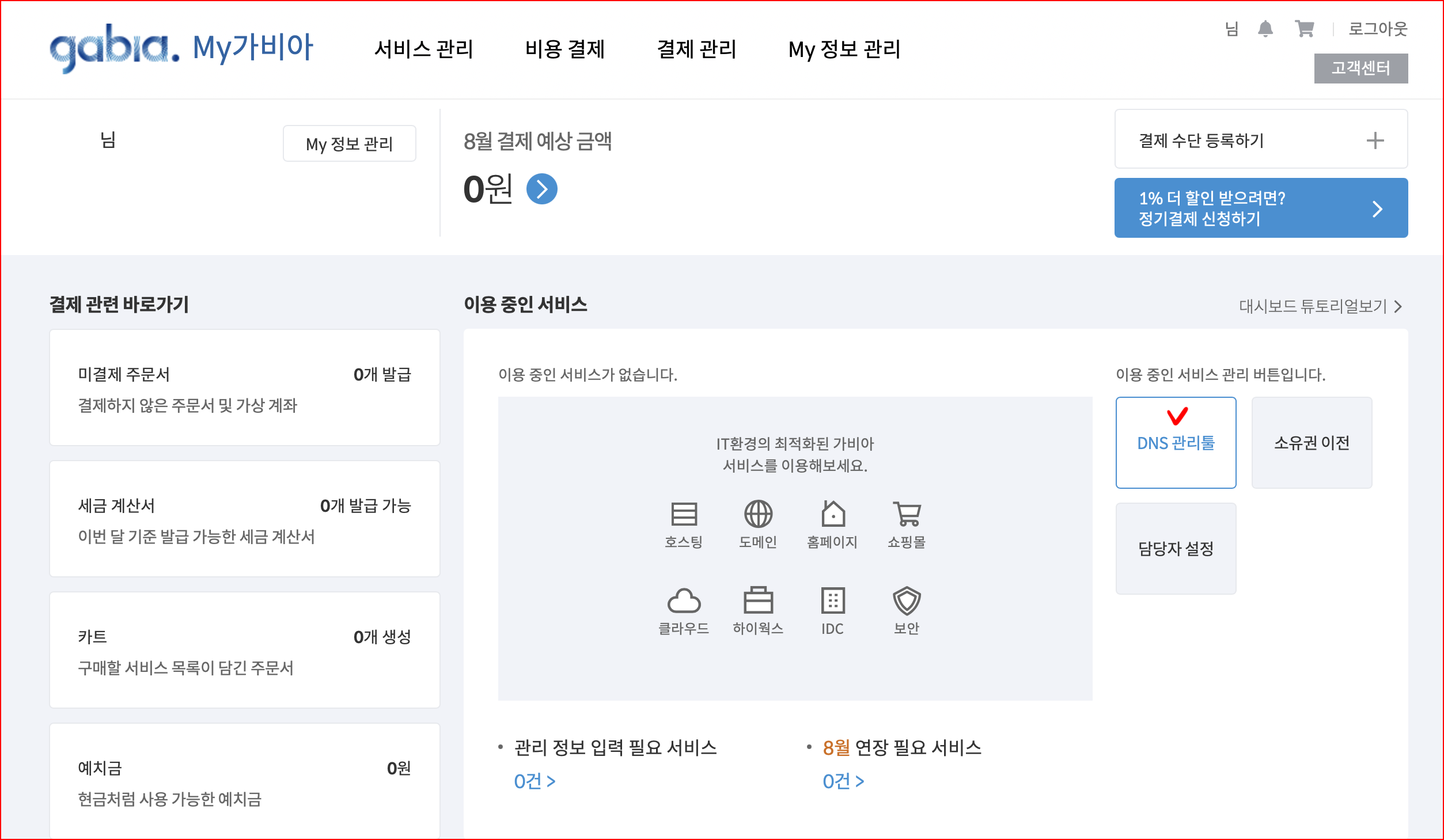 ① 가비아 (www.gabia.com) 홈페이지에 로그인 후 우측에 'DNS 관리툴' 버튼 클릭.