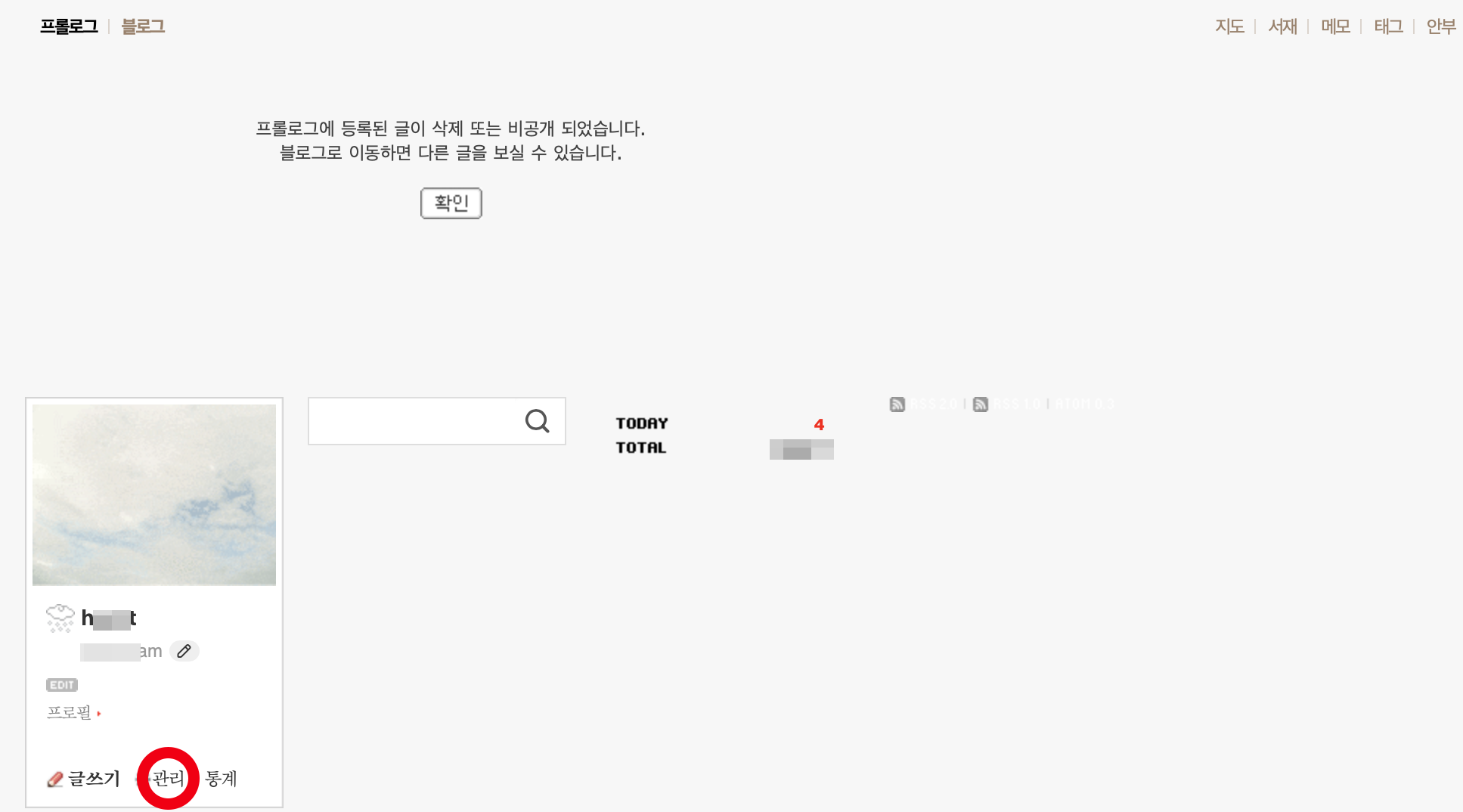 1. 네이버 블로그 메인 화면에서 프로필 썸네일에 있는 관리를 클릭합니다.