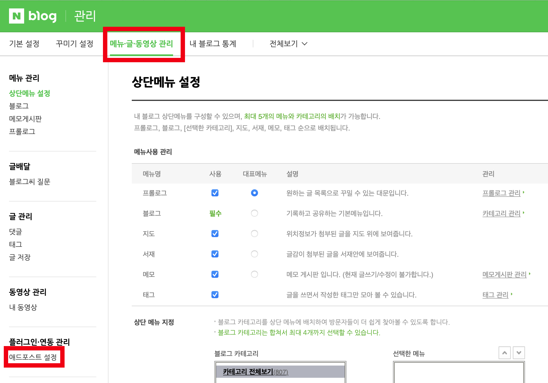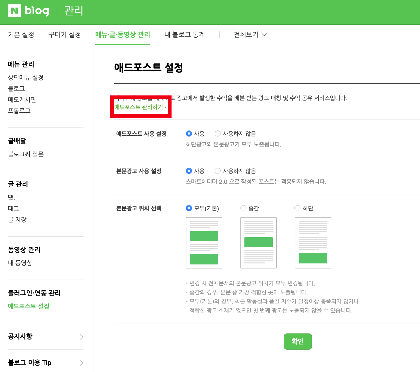 2. 블로그 관리 페이지로 오면, 상단 메뉴 중에 '메뉴 글 동영상 관리'를 클릭하고 왼쪽 메뉴 중에 '애드포스트 설정'을 클릭합니다. 그러면 애드포스트 설정 페이지가 나타나면서 애드포스트를 사용할 것인지, 본문 광고를 사용할 것인지, 본문 광고를 어떻게 할 것인지 위치를 선택할 수 있습니다.