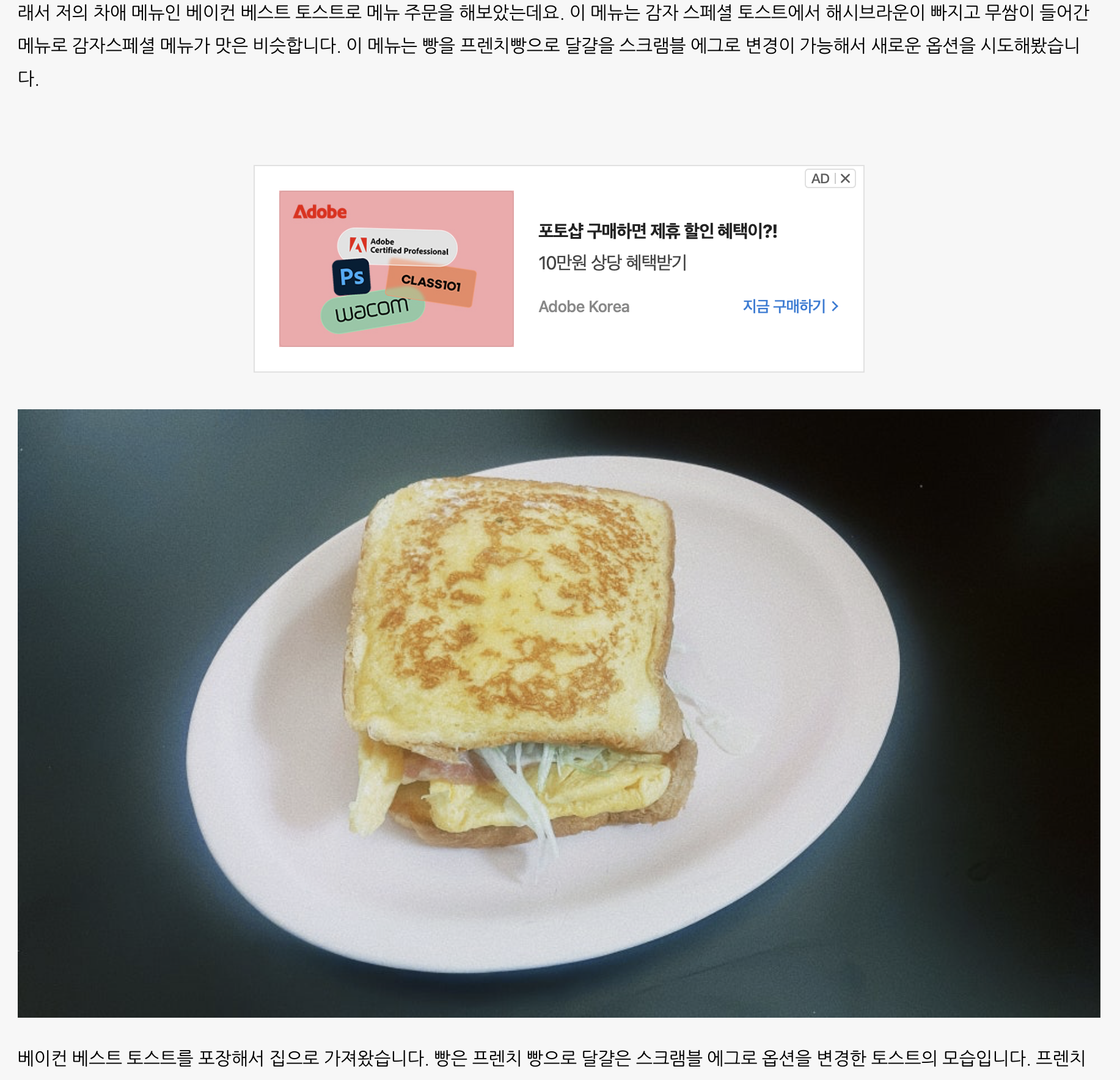바로 본인 블로그에 방문해 블로그 글을 보니 광고가 승인 이후 저절로 게재되고 있었습니다. 위 블로그 글 캡처본은 제가 쓴 이삭 토스트에 관련한 리뷰 글이었는데요. 글 중간에 작고 귀엽게 광고 팝업이 게재된 것이 보입니다. 광고 팝업은 글 중간에 2개 글 하단에 1개와 하단 광고 아래에 파워링크 광고로 총 4개의 광고가 게재되었습니다.