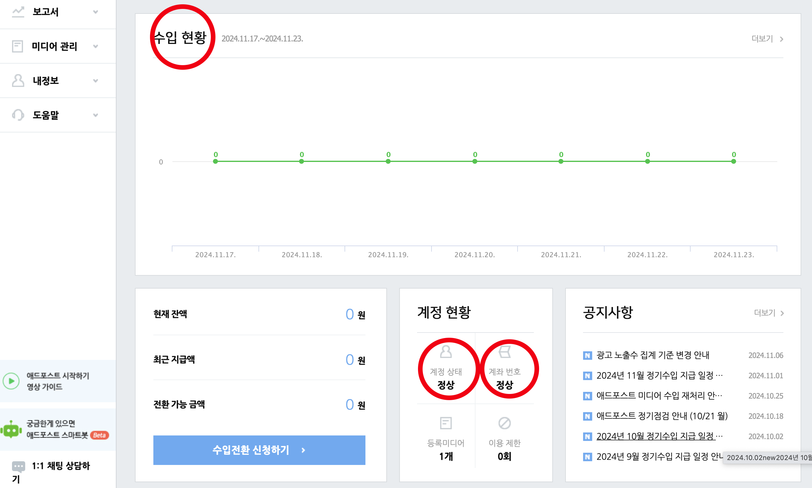 4. 제 애드포스트의 수입 현황입니다. 수입이 0원으로 확인되며 계정 상태와 계좌 번호가 정상으로 되어 있는 것을 확인 할 수 있습니다. 수익을 내기가 쉽지 않을 것 같지만 애드포스트 광고 게재가 된 것만으로도 우선 기쁜 마음입니다.