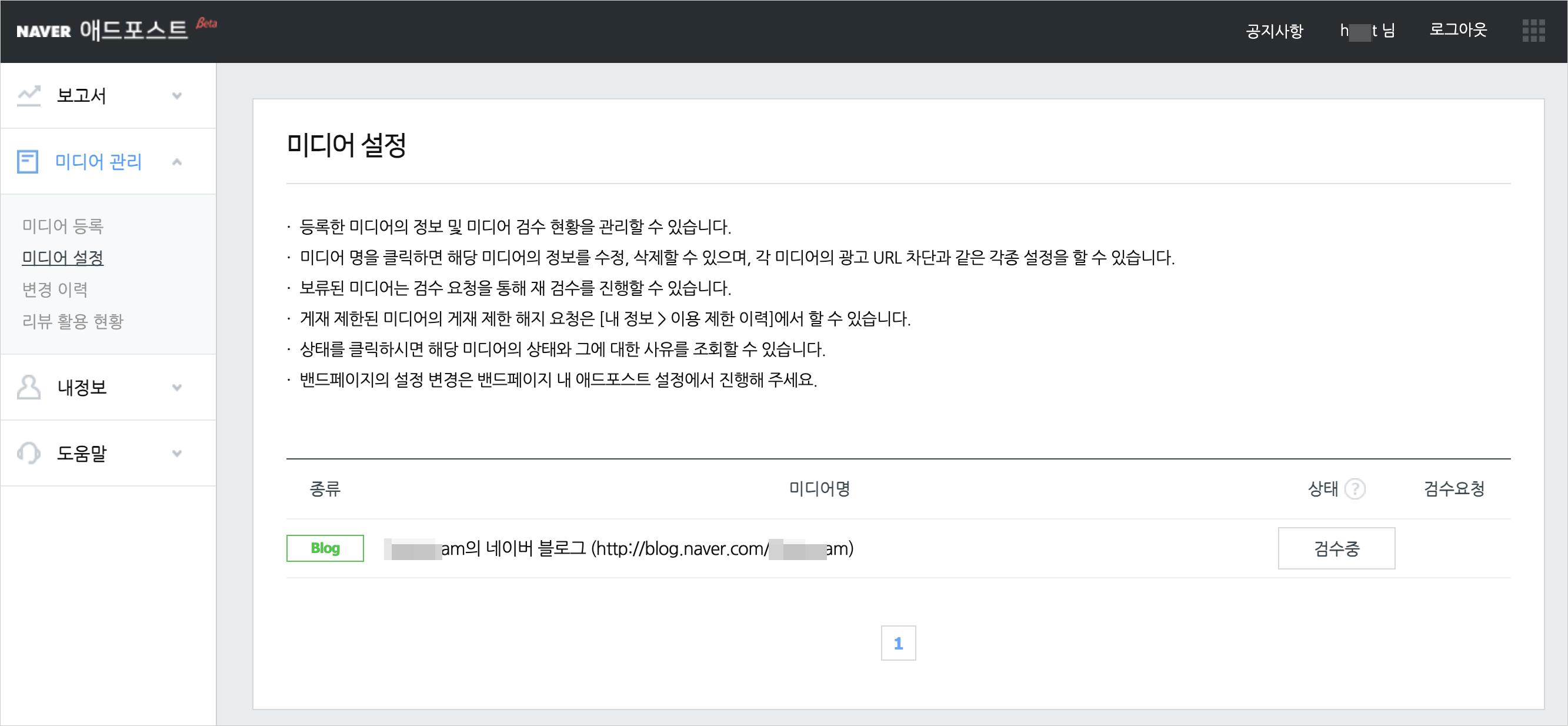 두 번째 단계로 미디어 등록을 했습니다. 네이버에 실명 인증이 된 미디어를 3개까지 등록할 수 있습니다. 우선 블로그 1개를 등록했습니다.