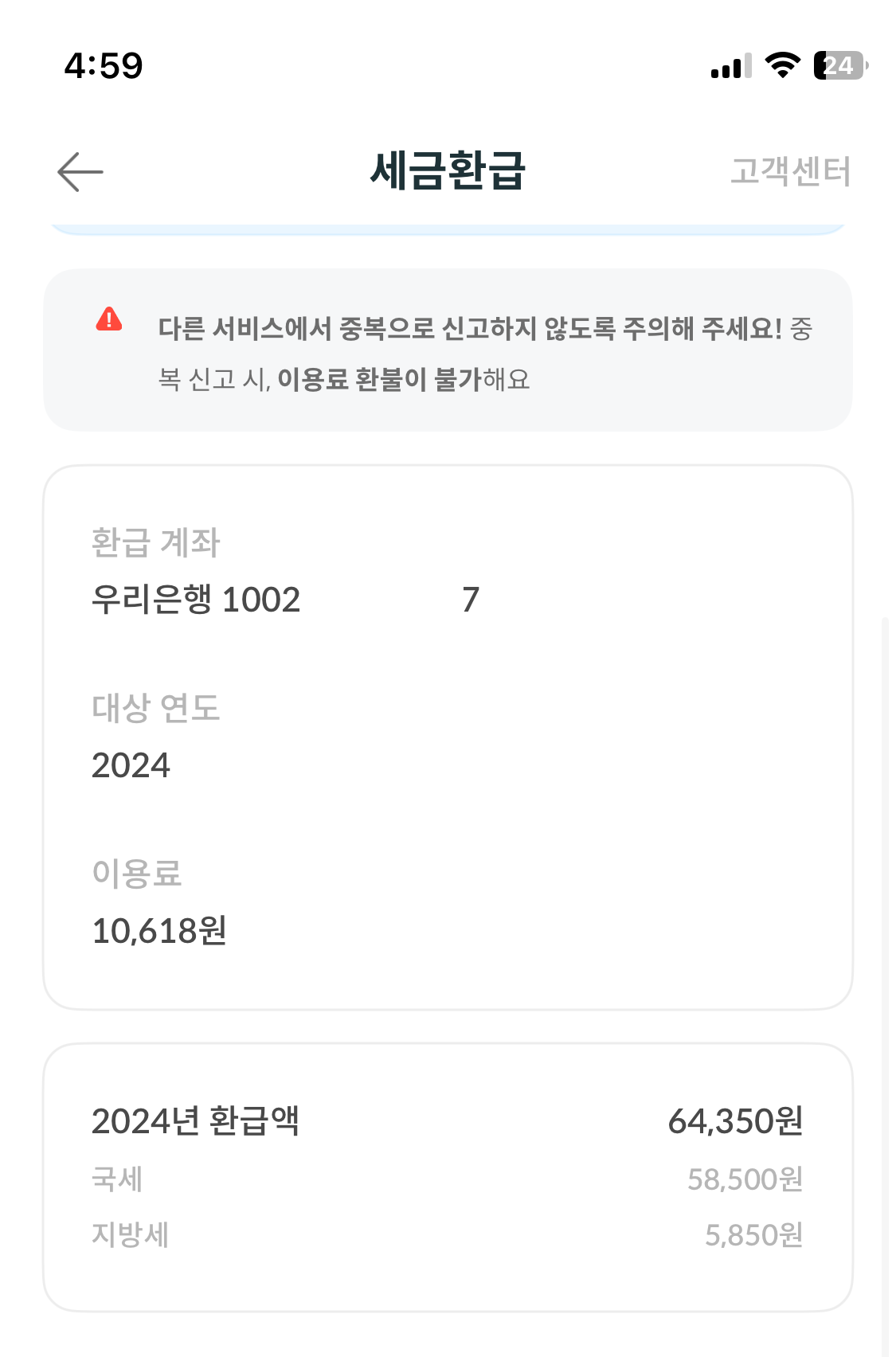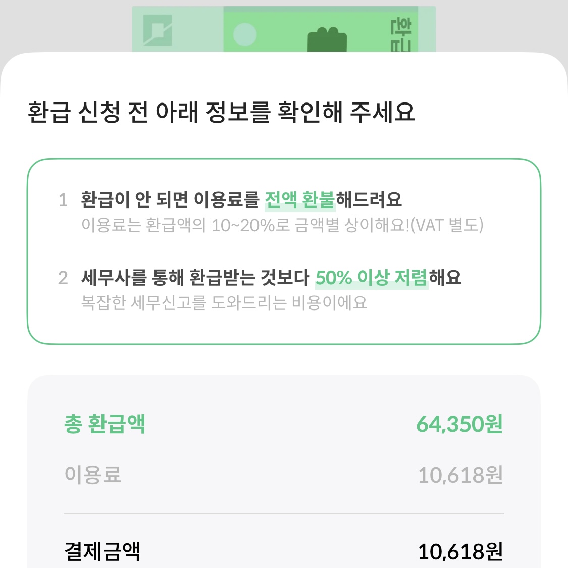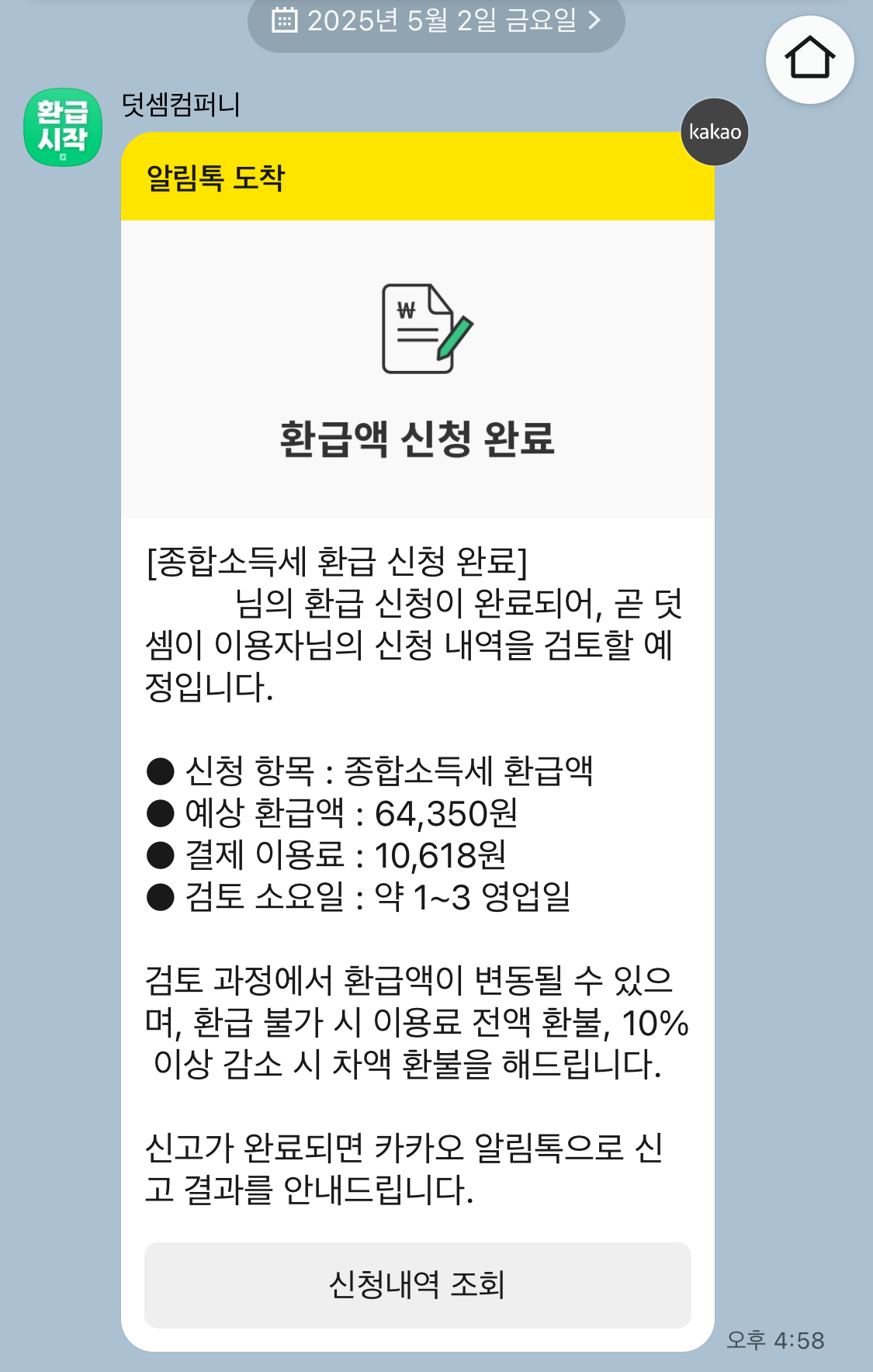 결제 진행 후, 환급 신청 완료 화면이 나옵니다.