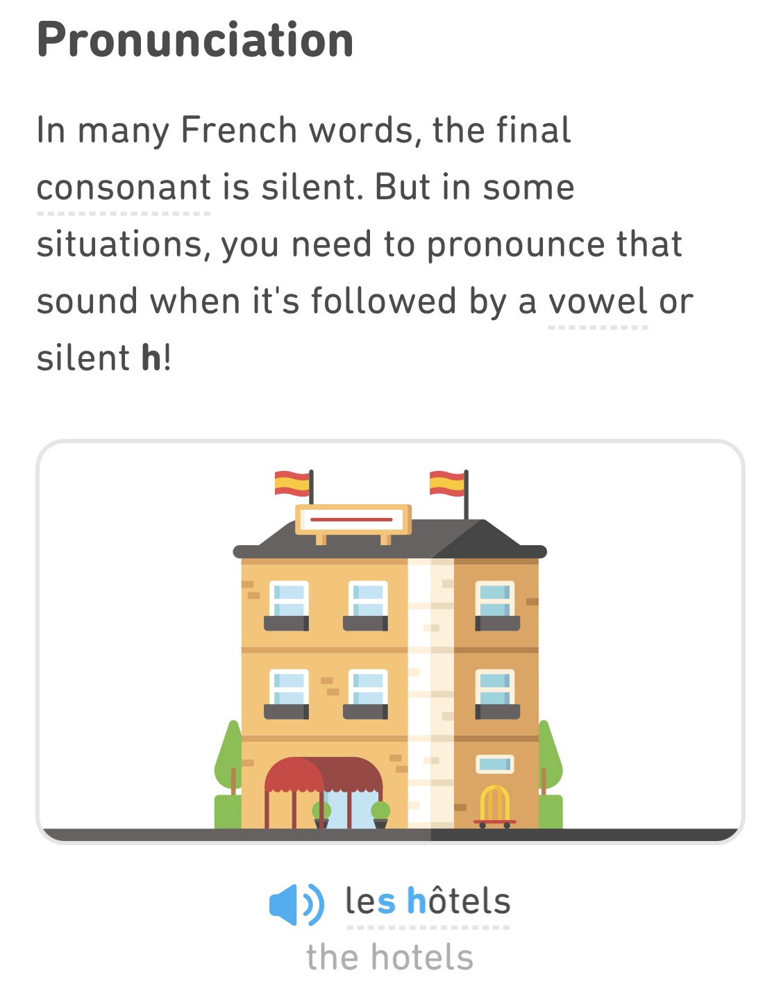 예시에서 보면 '호텔들'은 les hôtels [레조뗄]로 발음됩니다. les는 [레]로 발음하지만 hôtels [오뗄]의 묵음인 h 앞에 오면서 s의 발음을 해줍니다.