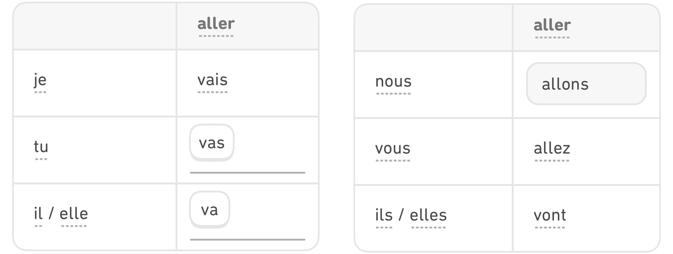 je vais [즈 배] tu vas [뛰 바] il va [일 바] elle va [엘 바] nous allins [누 잘롱] vous allez [부 잘레] ils vont [일 봉] elles vont [엘 봉]입니다.
