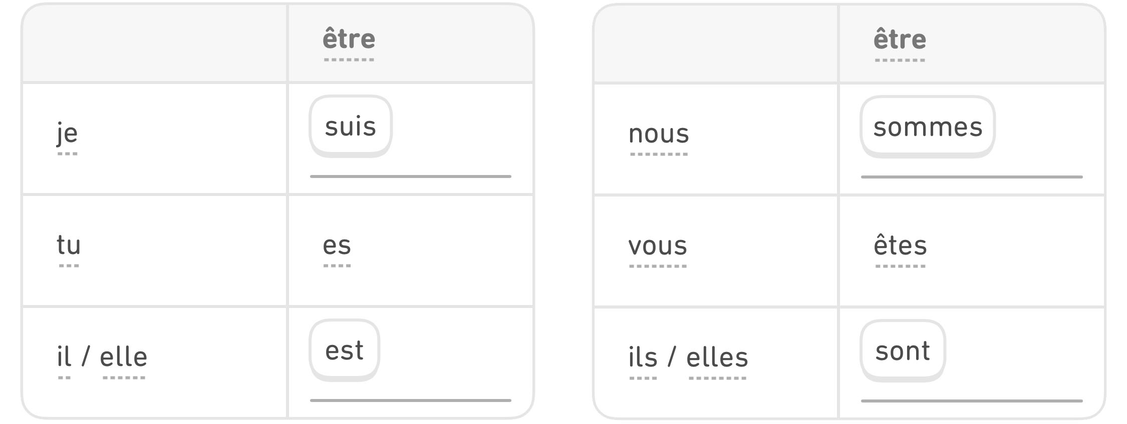 je suis [즈 스위] tu es [뛰 에] il est [일 레] elle est [엘 레] nous sommes [누 솜므] vous êtes [부 제뜨] ils sont [일 쏭] elles sont [엘 쏭]입니다.