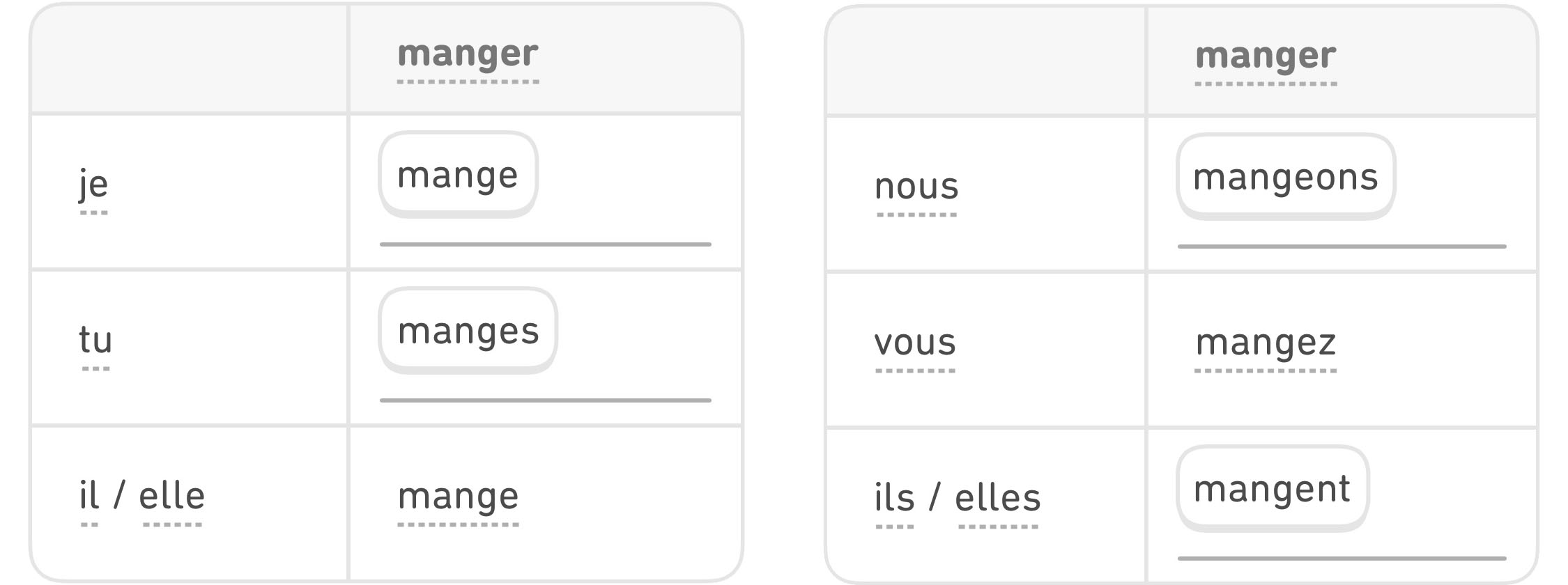je mange [즈 망쥐] tu manges [뛰 망쥐] il mange [일 망쥐] elle [엘 망쥐] nous mangeons [누 망종] vous manez [부 망제] ils mangent [일 망쥐] elles mangent [엘 망쥐]입니다.