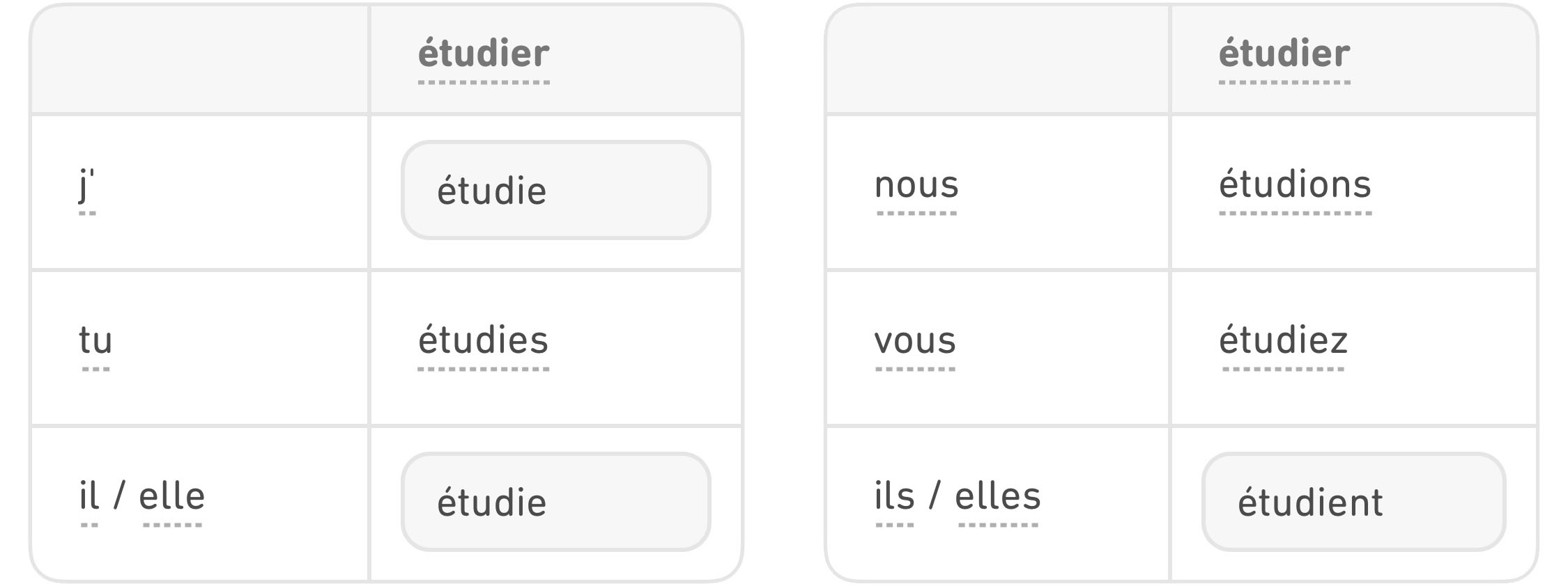 j'étudie [재 뚜디] tu étudies [뛔 뚜디] il étudie [일 에뚜디] elle étudie [엘 에뚜디] nous étudions [누 에뚜디옹] vous étudiez [부 에뚜디에] ils étudient [일 에뚜디] elles étudient [엘 에뚜디]입니다.