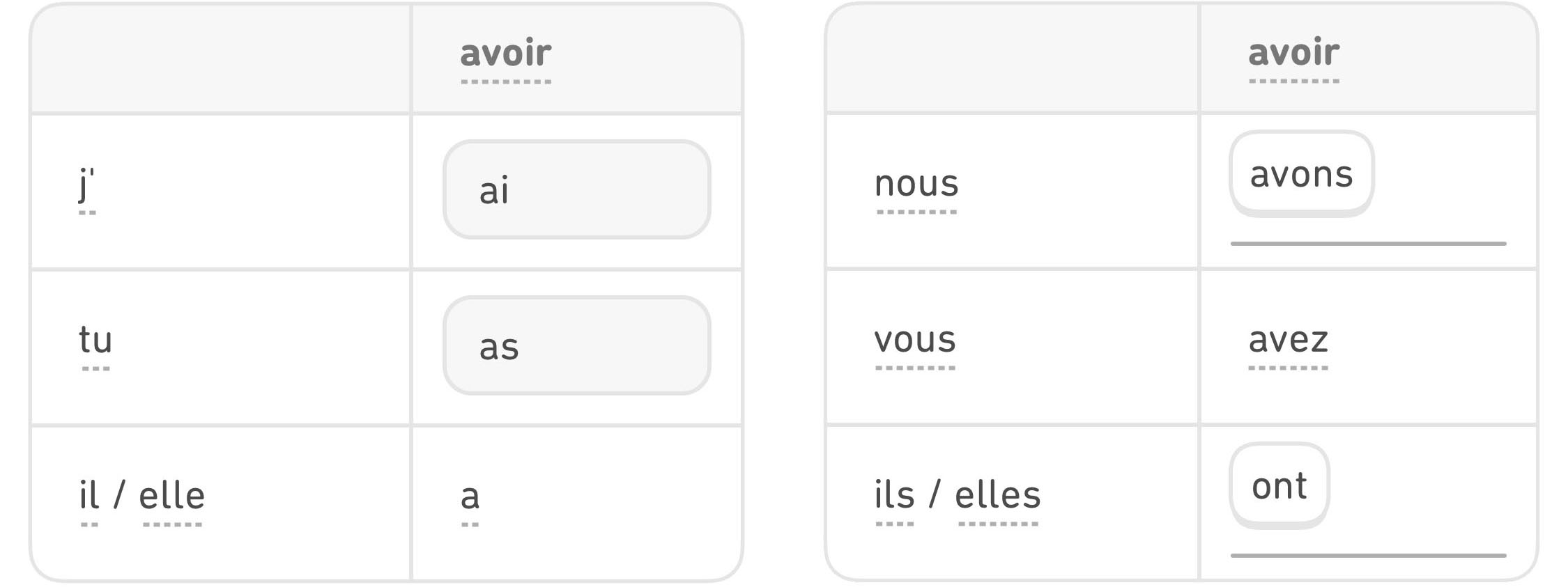 j'ai [재] tu as [뛰 아] il a [일 라] elle a [엘 라] nous avons [누 자봉] vous avez [부 자베] ils ont [일 종] elles ont [엘 종]입니다.