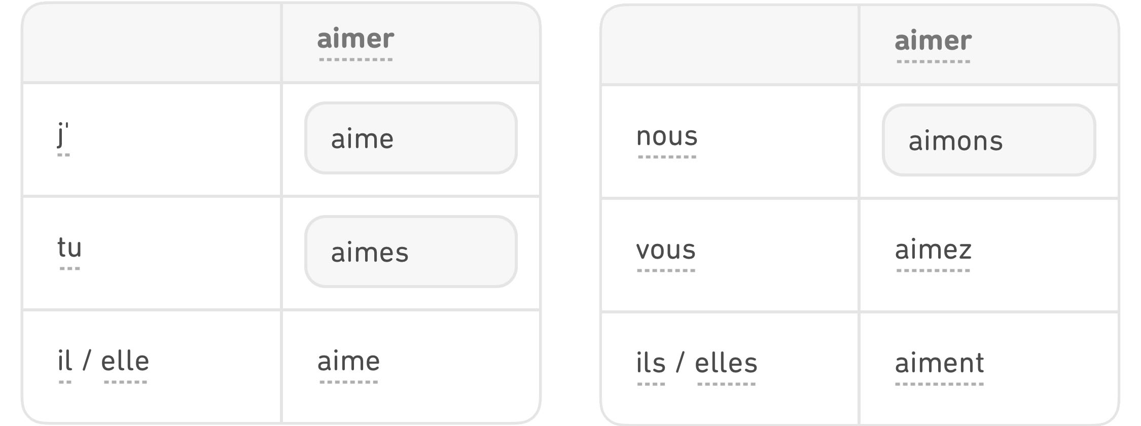 j'aime [잼므] tu aimes [뛰 에므] il aime [일 레므] elle aime [엘 레므] nous aimons [누 에몽] vous aimez [부 에메] ils aiment [일 레메] elles aiment [엘 레메]입니다.