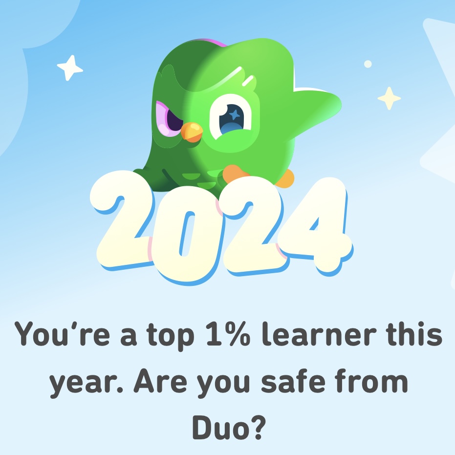 듀오링고에 들어가니 위와 같은 팝업이 떴습니다. 듀오의 표정이 우선 시선 강탈을 하고 있는데요. 무척 귀엽고 트렌디합니다. 그리고 내용을 보니 제가 top 1% learner에 들었습니다. 좋은 기분으로 듀오링고 2024년 리뷰를 살펴봤습니다.