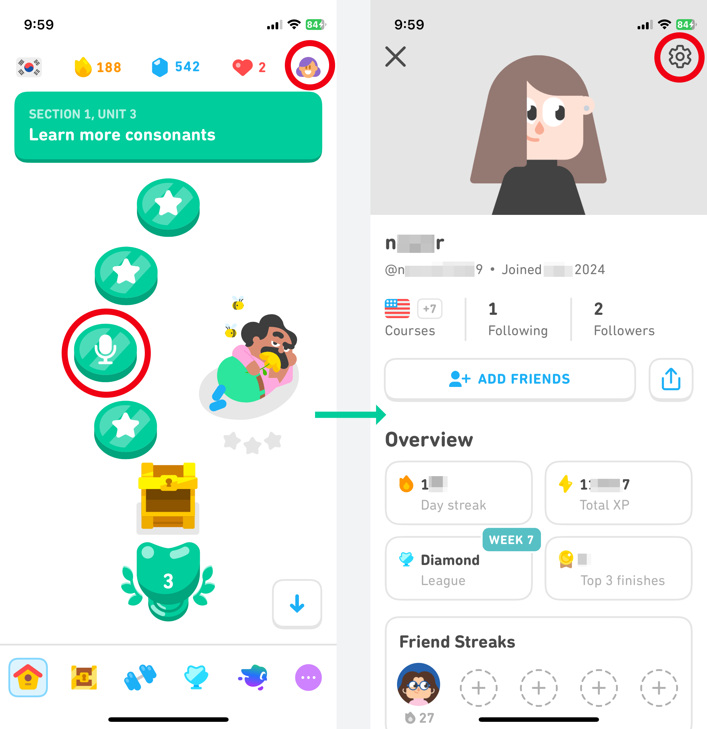 한국어 학습 맵, section1 unit3 스피킹 학습에서 오타 문제가 발견되었습니다. 이 맵이 나오는 페이지 상단 우측에 사람 얼굴 아이콘을 클릭하면 프로필 페이지로 이동합니다. 프로필 페이지에서 다시 우측 산당의 톱니 바퀴 아이콘을 클릭하면 설정 페이지로 이동할 수 있습니다.