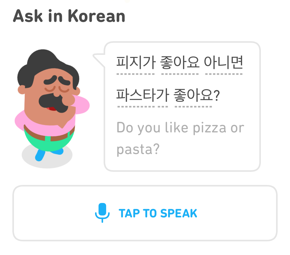 듀오링고 Korean (한국어) 학습 중에 발견한 오타 피지가 좋아요