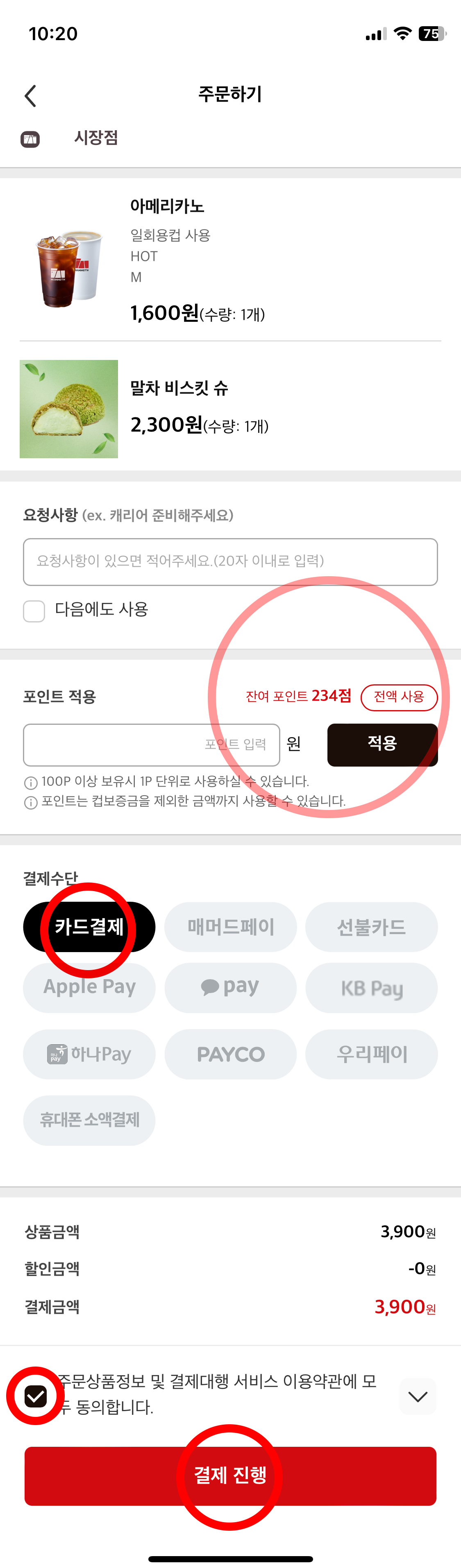 6. 주문하기 화면이 나타나면 주문할 목록을 확인하고 (저의 경우 아메리카노와 말차 비스킷 슈가 목록에 나옵니다.), 쌓인 포인트를 사용하고 싶으면 사용하고 싶은 액수만큼 적용하고, 결제 수단을 고릅니다. (저는 카드결제를 선택했습니다.), 이용 약관에 체크, 결제 진행을 터치합니다.