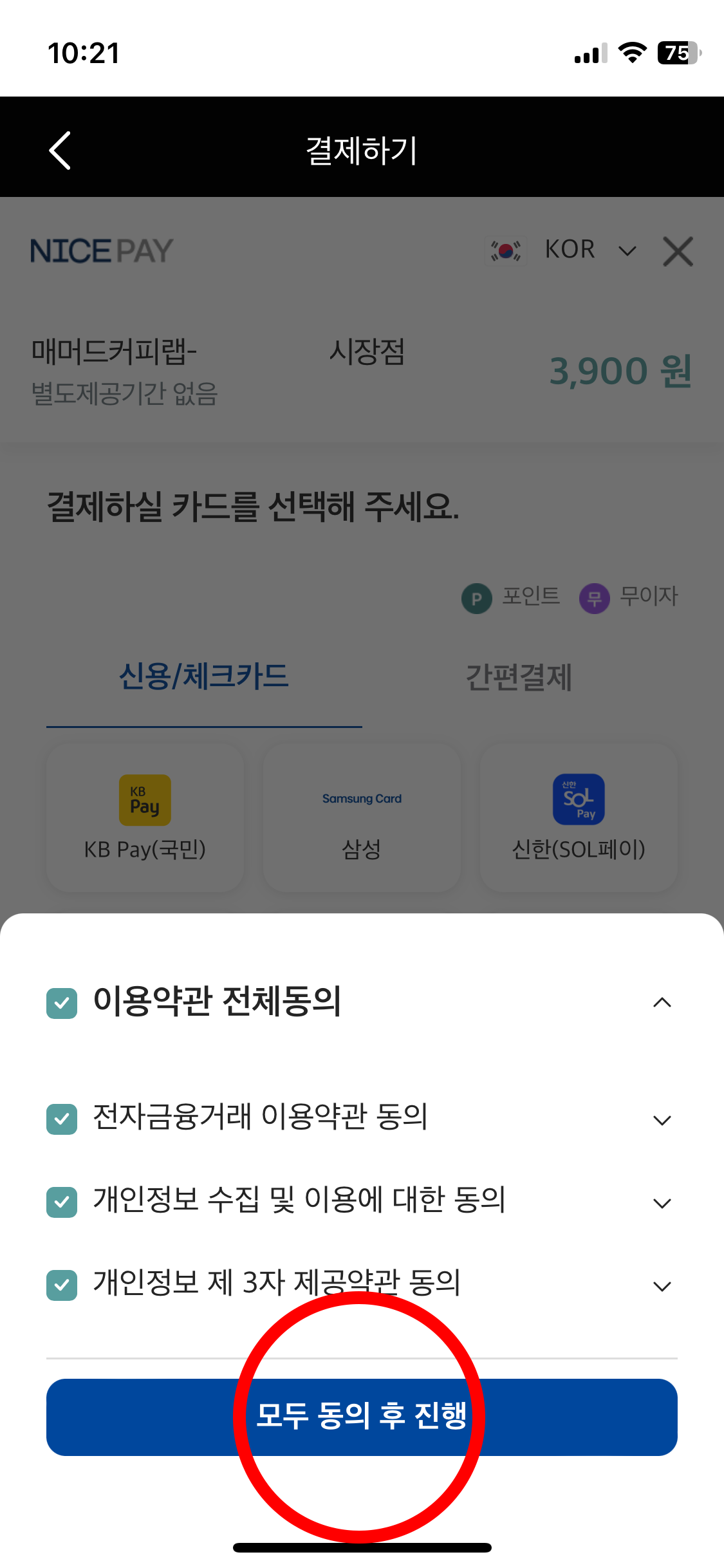 9. 결제 정보 확인 후, 결제 금액 (3,900원) 결제를 터치합니다.