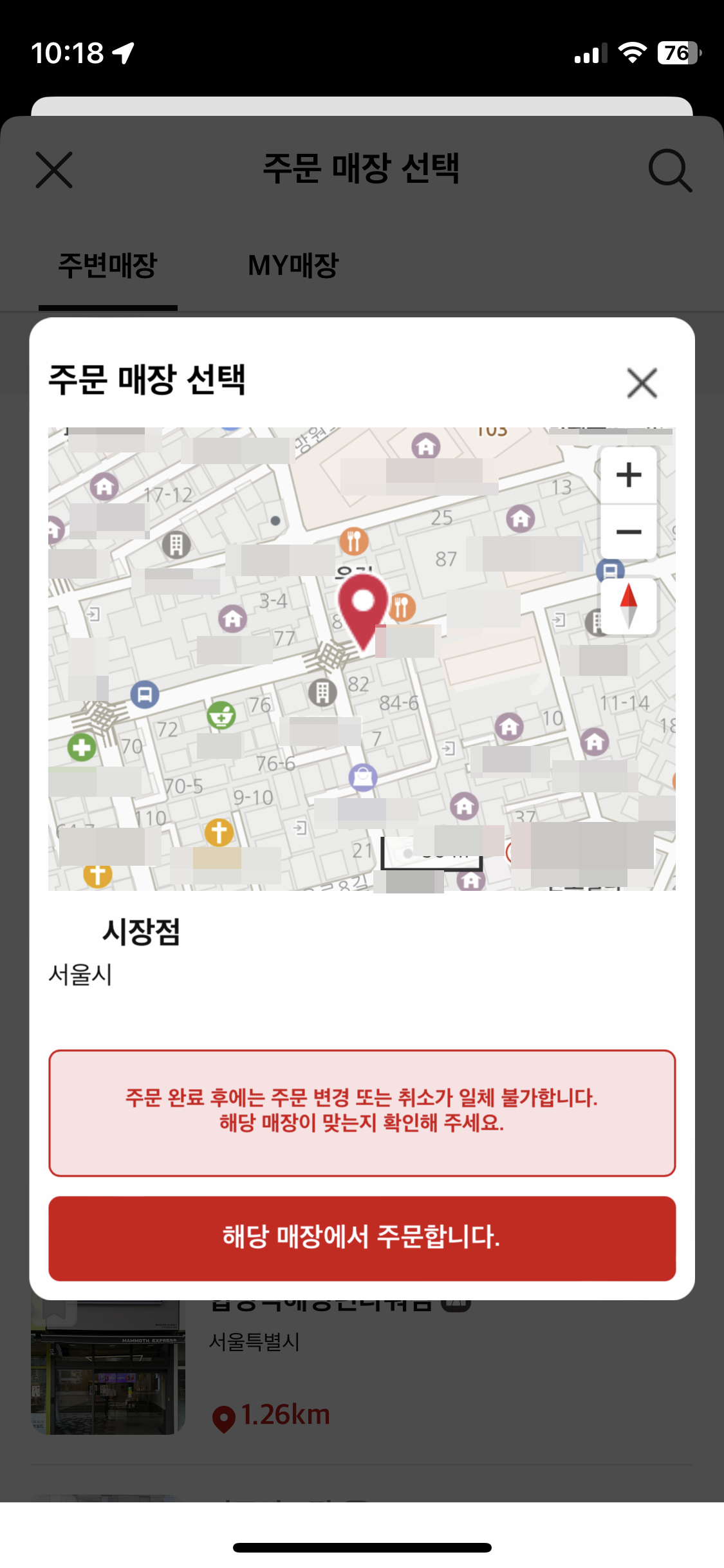 3. 지도가 뜨면 지점 위치를 확인하고 해당 매장에서 주문합니다 버튼을 터치합니다.