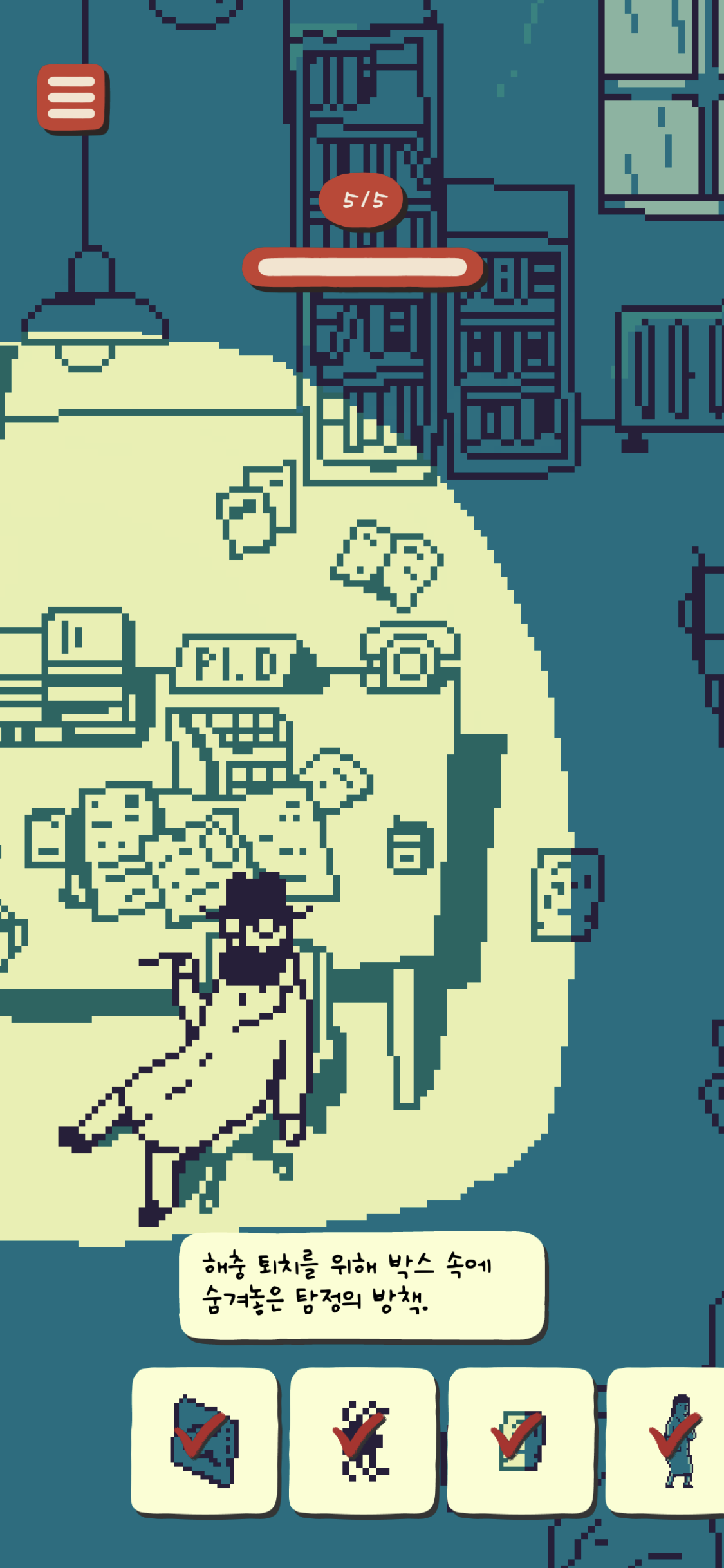 숨은 그림 찾기 배경은 탐정의 방입니다. 픽셀로 부셔지는 느낌의 스타일이 멋스럽습니다. 중앙 상단에 보면 5/5라고 써져 있고, 하단에 보면 찾아야 할 그림들이 모두 체크되어 있는데 찾아야 할 5개의 그림 중에 5개의 그림을 다 찾아서 체크가 다 된 클리어된 상태로 마무리 되고, 유지가 되었습니다. 이 점이 무척 신선하고 좋습니다. 마치 체크리스트의 항목을 하나를 끝낸 것처럼 쉬원하달까요. 더욱 좋은 이유는 이 그림에서 숨은 그림 찾기를 다시 하고 싶을 때 왼쪽 상단의 메뉴를 눌러 들어가면 restart 버튼이 있어서, 그 버튼을 눌러 다시 할 수 있습니다.