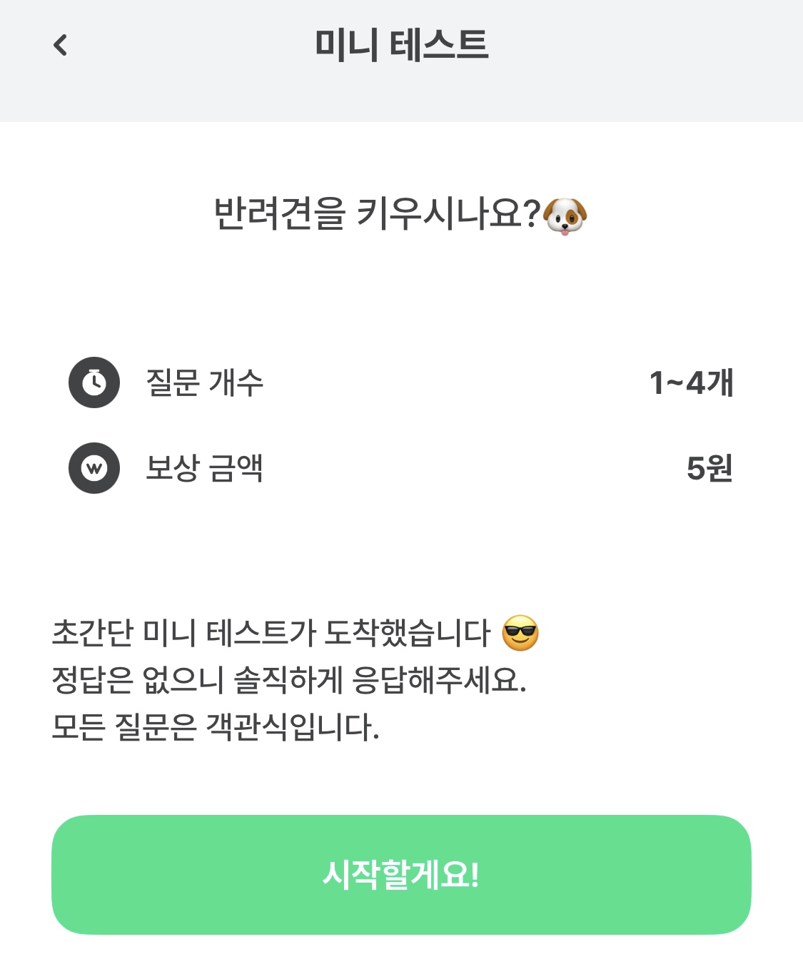 시작 전에 질문 개수가 어느 정도 될지 보상 금액은 얼마일지 표시됩니다. 초간단 미니 테스트라는 안내가 있고 솔직하게 응답할 것을 당부하고 있습니다.