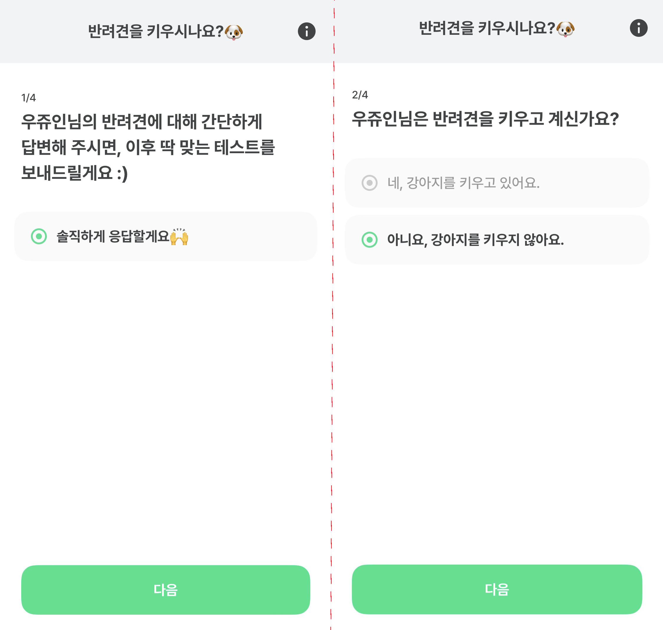 먼저 솔직하게 응답할게요하고 다시 한번 체크를 한 뒤 설문 1개가 준비되어 있었습니다. 반려견을 키우시나요? 라는 질문에 아니요, 강아지를 키우지 않아요.에 체크했습니다.