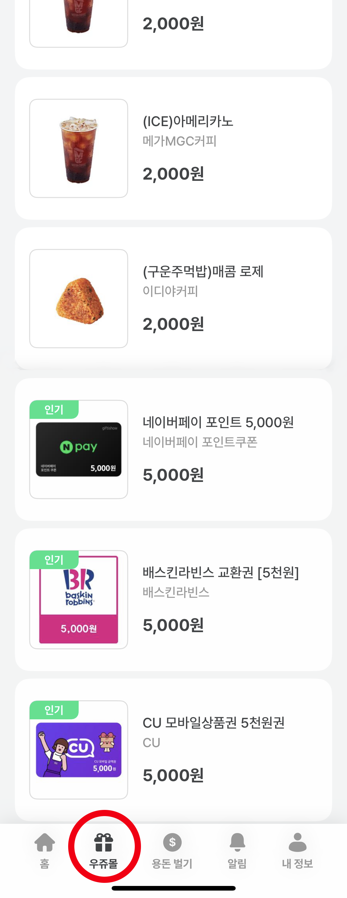 그리고 쌓인 포인트는 우쥬몰 메뉴에서 쿠폰으로 교환해 사용할 수가 있는데 정말 좋은 점은 가격입니다. 2,000포인트로 2,000원에 해당하는 메가커피 아이스 아메리카노 쿠폰으로 교환이 가능합니다. 다른 걷기 앱 같은 경우에는 포인트의 가치가 원화의 가치보다 낮아서 더 많은 포인트를 모아야 했던 반면 우쥬몰은 포인트의 가치와 원화의 가치가 1 : 1입니다. 메가 커피는 물론 커피의 경우 할리스, 아티제 등 다양한 카페 음료 쿠폰으로 변경이 가능하고 뿐만 아니라 800여가지의 다양한 상품 쿠폰과 교환이 가능합니다.