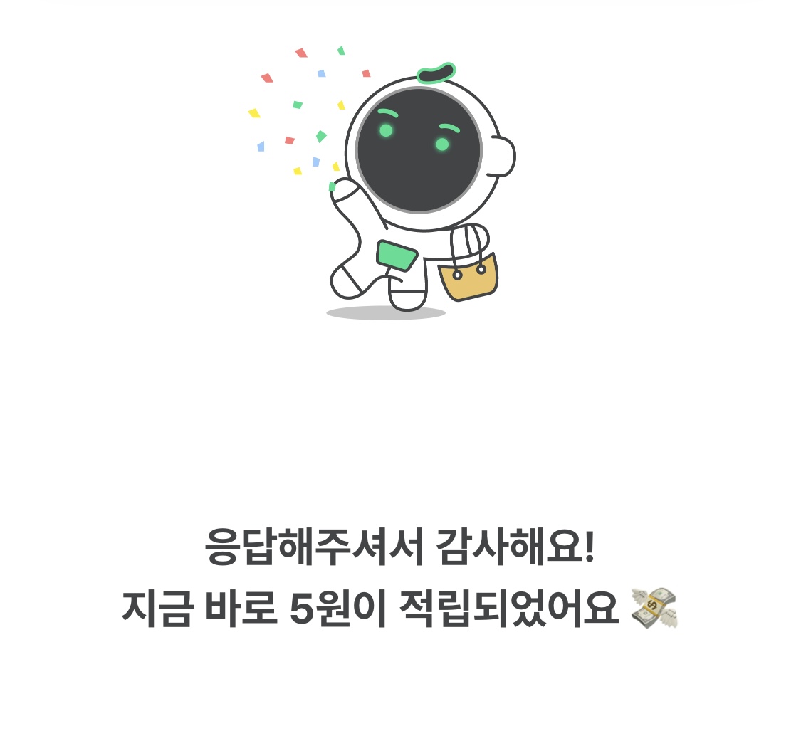 그리고 테스트가 끝났습니다. 뭔가 쉽고 재밌습니다. 테스트 마다 적립 금액은 차이가 납니다. 그리고 만약 제가 네 강아지를 키우고 있어요.에 체크했다면 그와 관련한 다른 설문을 보내줬을 것으로 예측됩니다.