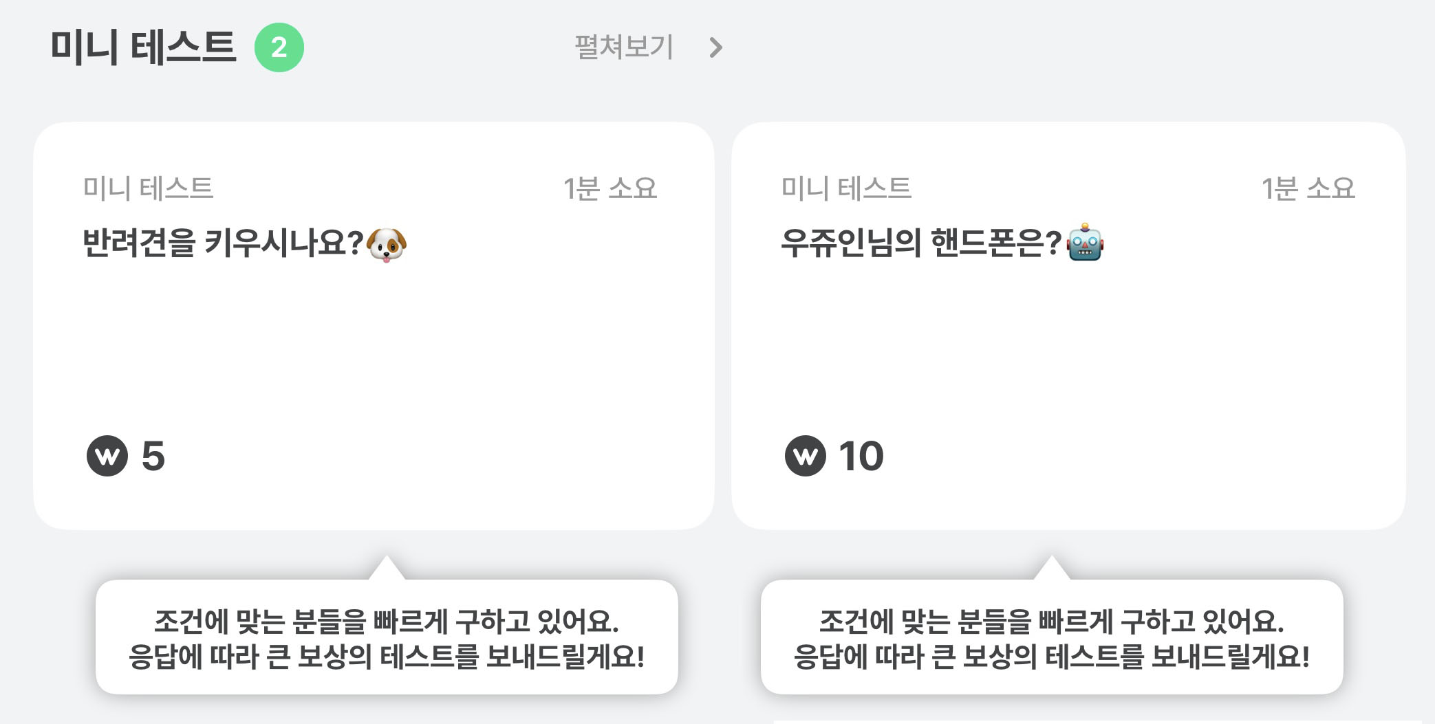 앱을 실행하면 참여 가능한 테스트들이 올라와 있습니다. 저는 이번에 2개의 설문이 업데이트 되어 올라온 것을 발견했습니다.