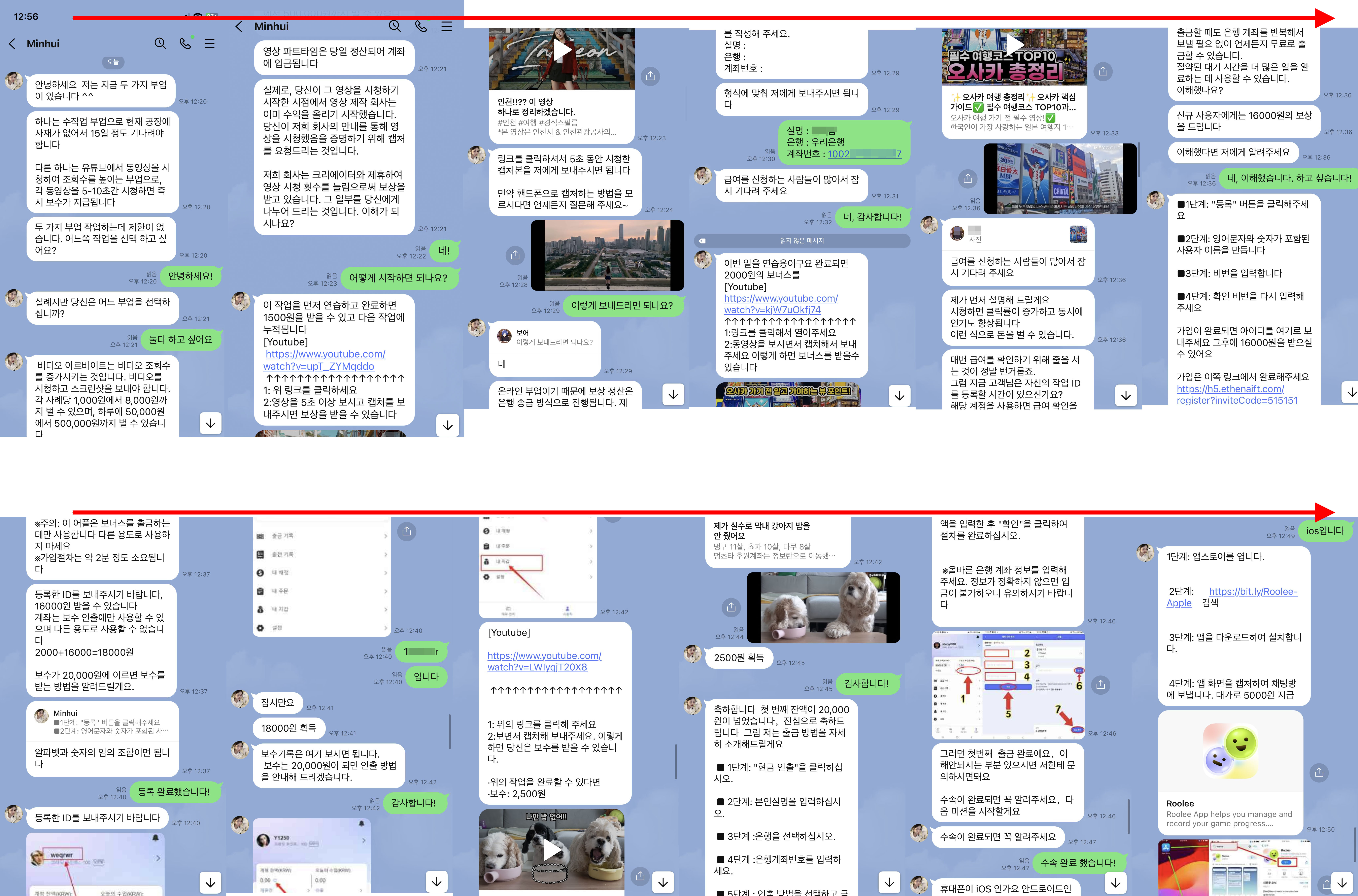 3. 라인 채팅 창을 통해 대화를 이어갑니다. 그런데 갑자기 수작업 부업은 지금 물량이 없어서 동영상 시청을 하고 조회수를 올려 보수를 받는 일을 추천합니다. 유튜브 동영상 링크를 주며 동영상을 보고 캡처만 해서 인증하면 오늘 바로 수당을 준다고 합니다. 동영상을 캡처해서 보내면 '2500원 획득' 이런식으로 리액션을 합니다.