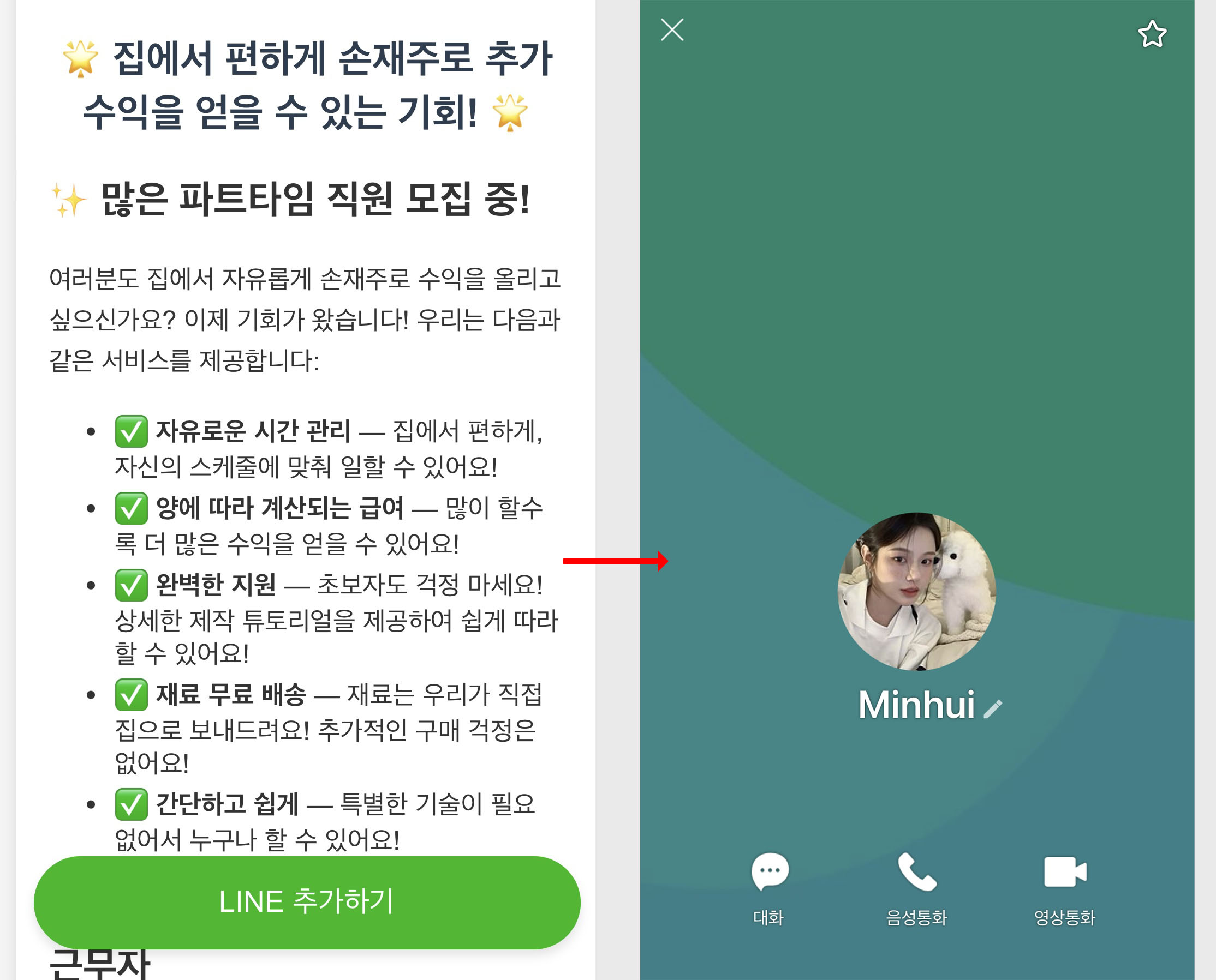 2. 부업에 대한 설명이 나오고 업무와 소통을 위해 라인 메신저로 연결됩니다. 라인 메신저에 연결되면 상담사와의 1 :1 대화방에 초대됩니다. 왠지 올려진 프로필 사진은 도용했을지도 모르겠다고 생각됩니다. 혹시 그런 사실을 알고 계신다면 저에게 알려주세요. 이 사진도 바로 내리겠습니다. 저 초록색 배경화면은 라인의 기본 배경화면인데요. 이것만 봐도 사기 계정을 새로 팠나? 하는 의심이 들 수 있습니다.