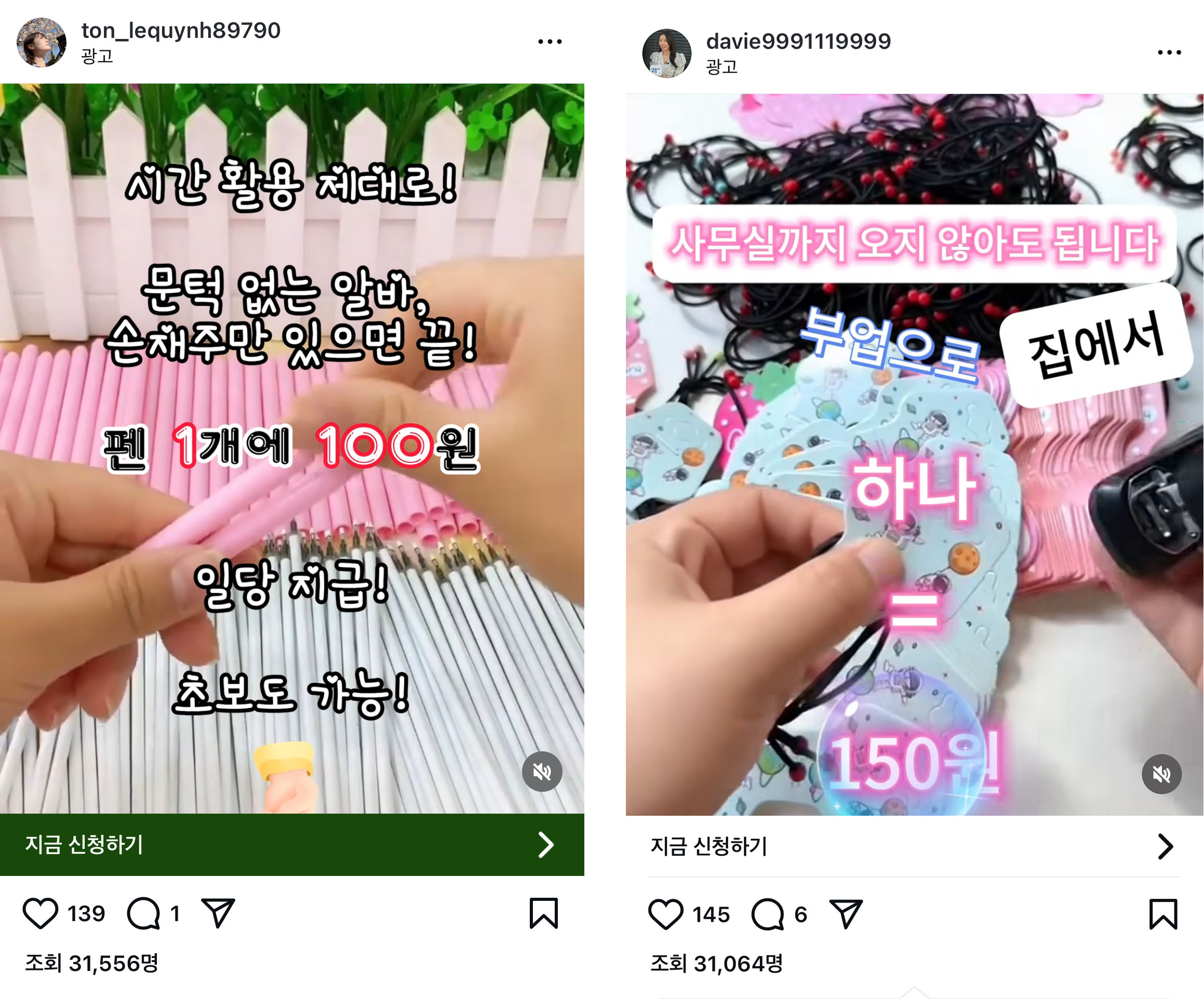 1. 인스타그램으로 N잡러들에게 솔깃한 부업을 제안하는 광고가 피드에 노출되고 있습니다. 요즘은 N잡의 시대라서 이런 광고에 솔깃하실텐데요. 결론부터 말씀드리자면 이것은 사기입니다. 위 광고에서 지금 신청하기를 클릭하면 다음 화면이 나옵니다.