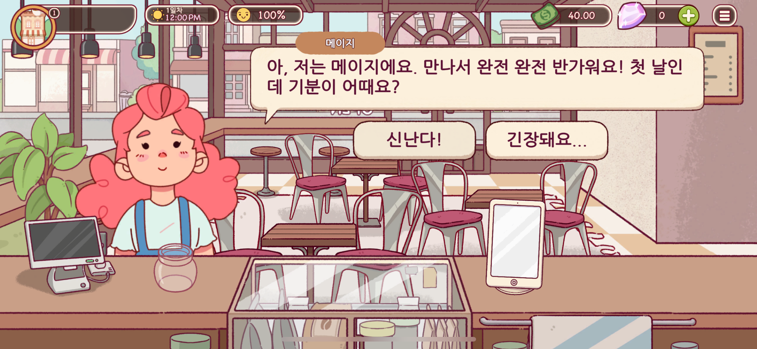 게임 1일차를 시작하자마자 첫 손님이 왔습니다. 그런데 영어로 나와서 일단 언어를 변경했습니다. 게임 화면에서 오른쪽 위쪽에 3줄 메뉴를 클릭하고 설정 버튼을 클릭하면 언어를 바꿀 수 있습니다.