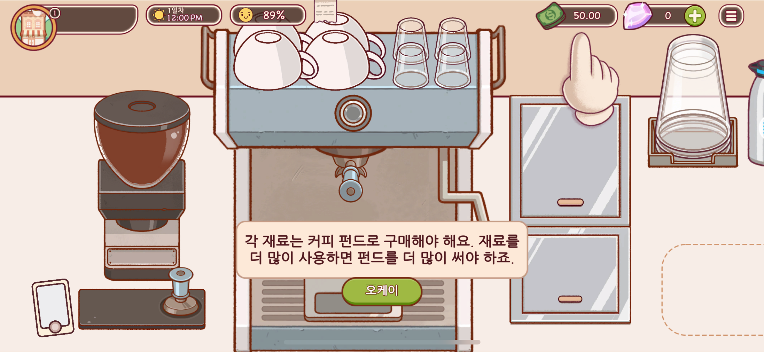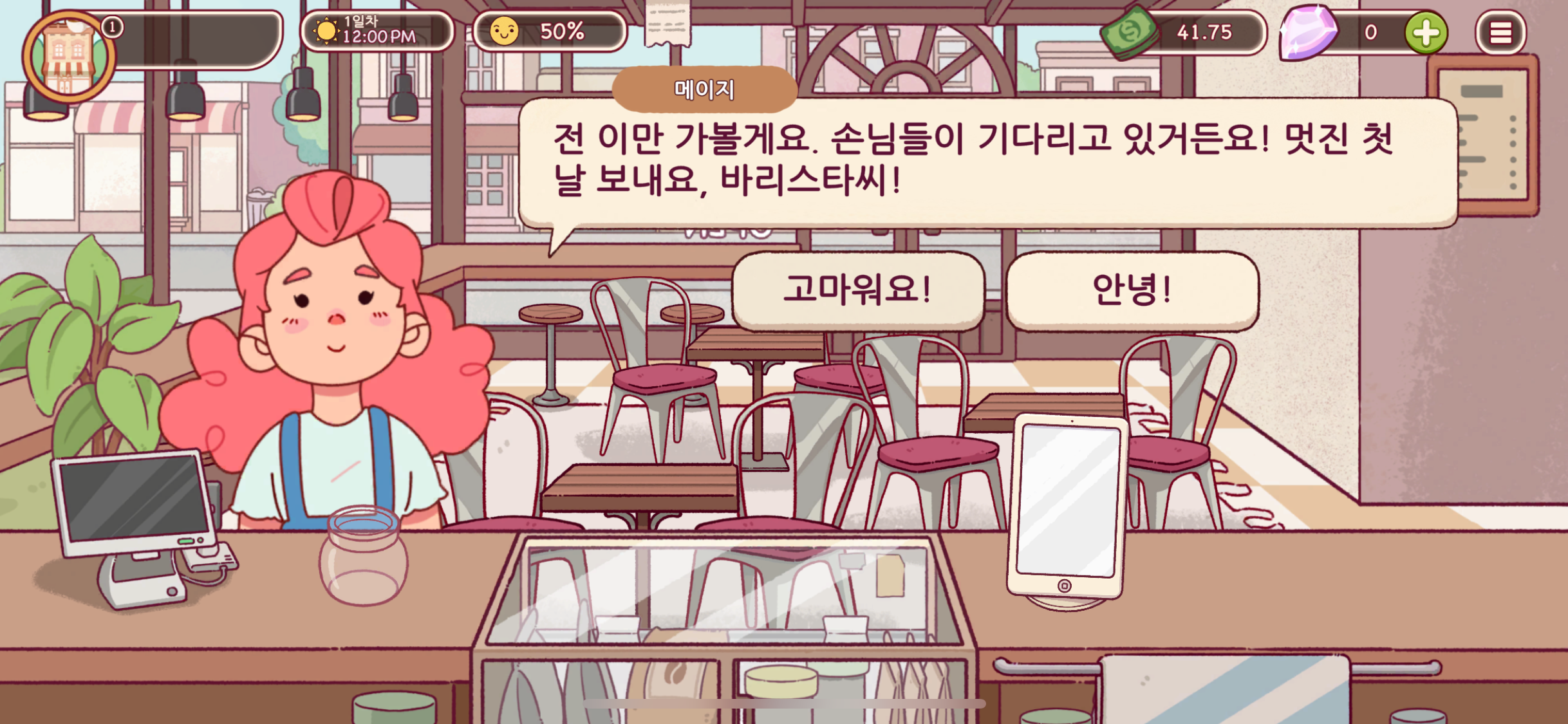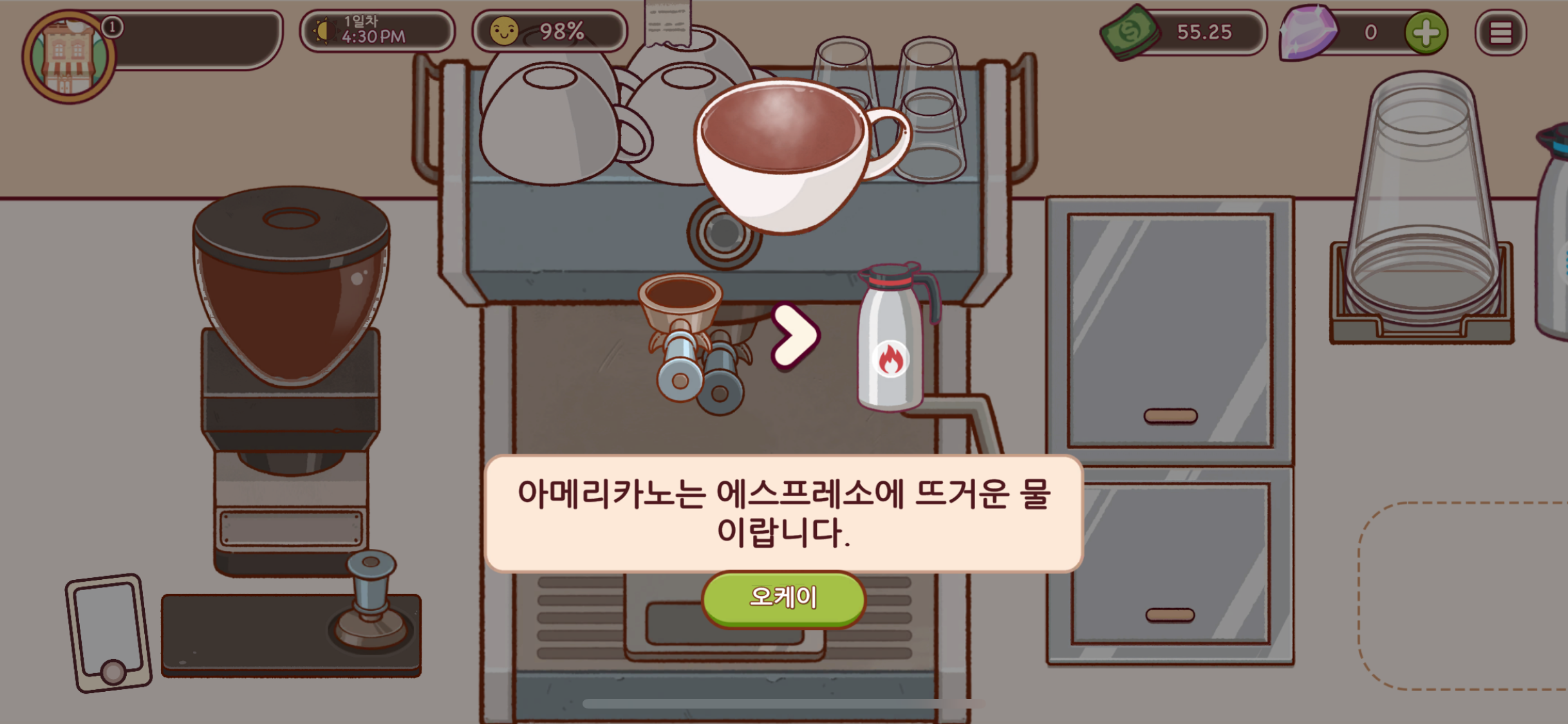 화면 캡처를 하면서 게임을 하느라 집중을 못해서 손님들에게 만족스런 커피를 못 만들어 준 것 같습니다. 게임이 너무 예쁘고, 처음을 간직하고 싶어서 캡처를 안 할 수는 없었습니다. 아무튼 저는 실제로 커피를 좋아하기도 해서 이 게임이 만들어져서 행복하고 좋습니다.