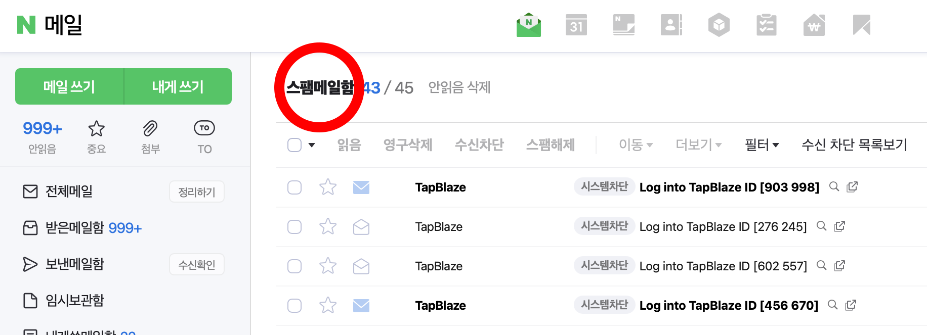 저는 네이버 메일을 쓰고 있습니다. 그런데 받은 메일함에 탑블레이즈로부터 메일이 오지 않아서 조금 헤맸습니다. 혹시나 하고 스팸 메일함을 보니 제가 로그인을 시도한 횟수만큼 탑블레이즈에서 코드를 전송한 메일이 와 있었습니다. 가장 최근에 받은 코드가 적힌 메일을 스팸 해제하고, 그 코드를 좋은 커피 위대한 커피 게임에서 바로 직전에 이메일을 적었던 그 빈칸에 넣었더니, 로그인에 성공했습니다.
