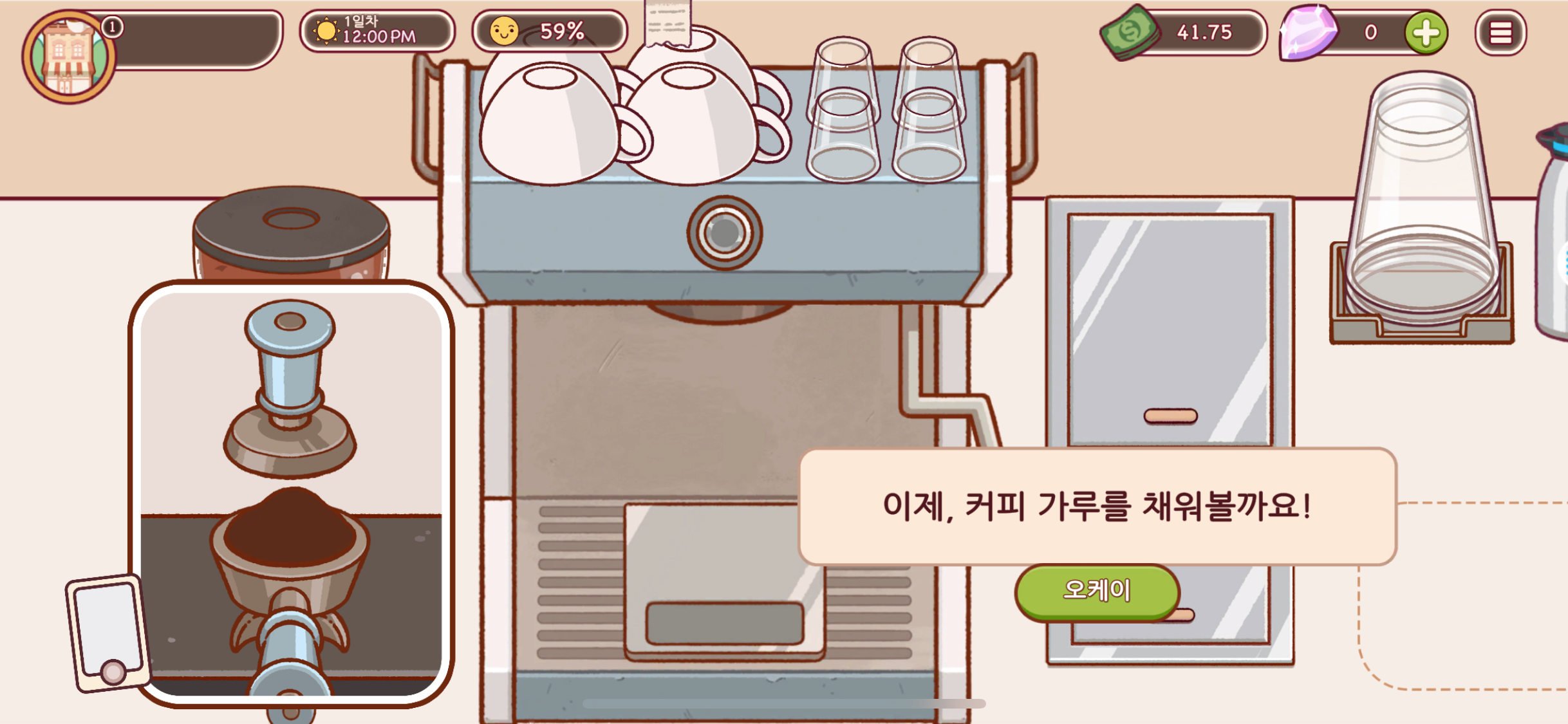 다음은 주방의 모습이 나타납니다. 에스프레소를 뽑는 과정을 차근차근 설명해줘서 따라서 진행하면 됩니다. 커피를 만드는 과정이 무척 디테일해서 재미있습니다. 포터필터와 같은 전문적인 도구의 이름이 나타나고, 그것들을 다뤄야 합니다.