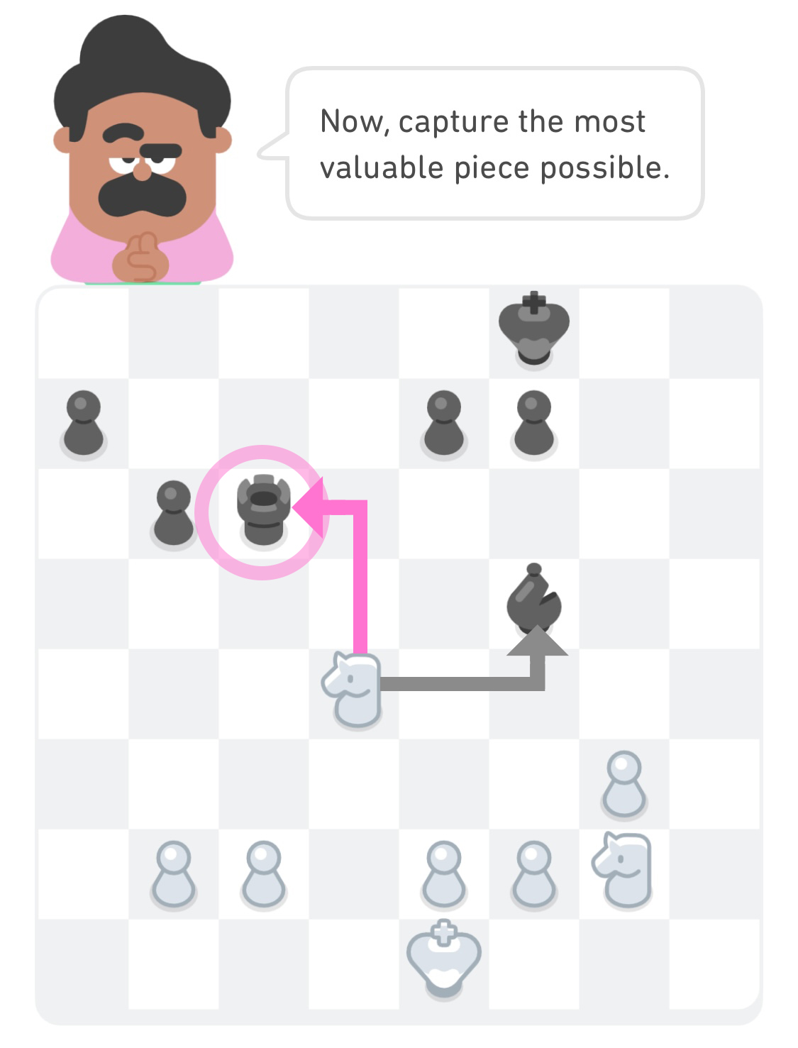 위의 그림을 보면 하얀 나이트가 룩과 비숍을 먹을 수 있는데, 룩은 5포인트의 가치, 비숍은 3포인트의 가치가 있으므로