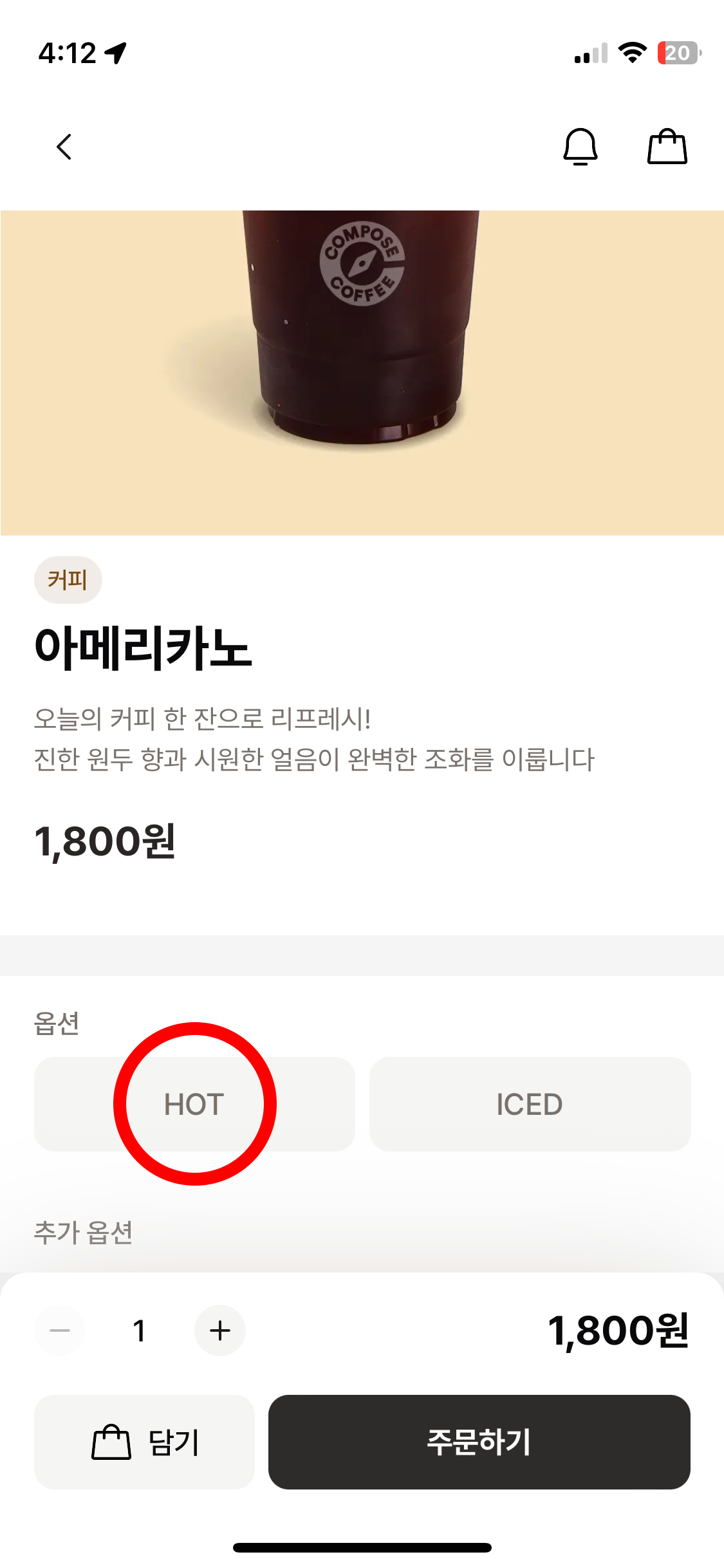기본적으로 아이스 아메리카노 화면이 먼저 나타나지만, HOT을 클릭해 옵션을 변경하여 따뜻한 아메리카노를 주문할 수 있습니다.
