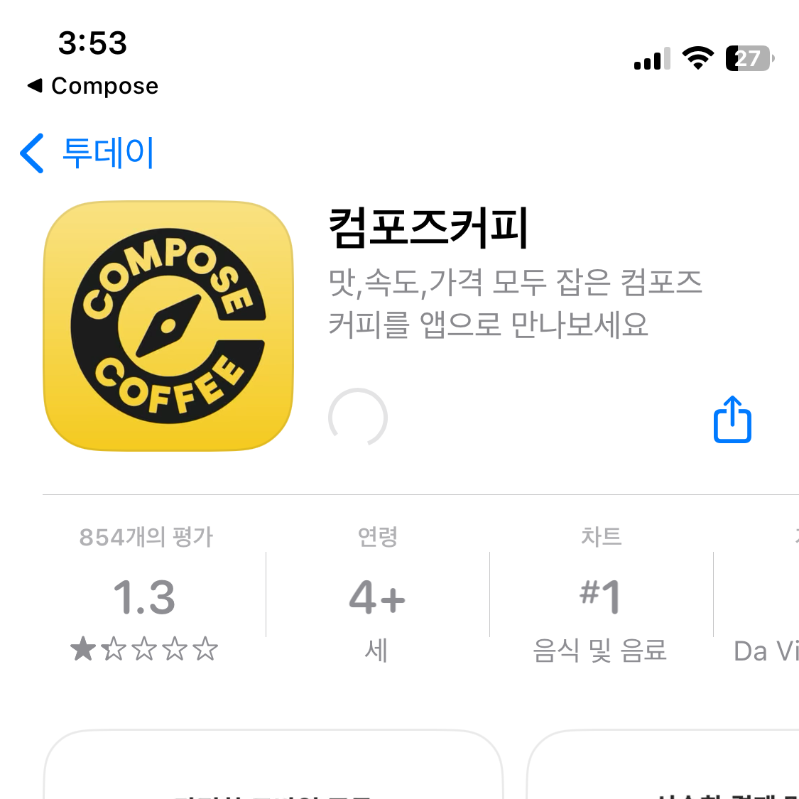 기존에 사용하던 컴포즈 커피 앱에 들어갔더니, 새롭게 앱이 출시 되었다고 새로운 앱을 설치하라는 메시지가 떴습니다. 여러분들도 이 화면을 보셨나요? 설치 버튼을 누르니, 앱스토어로 연결되었습니다.