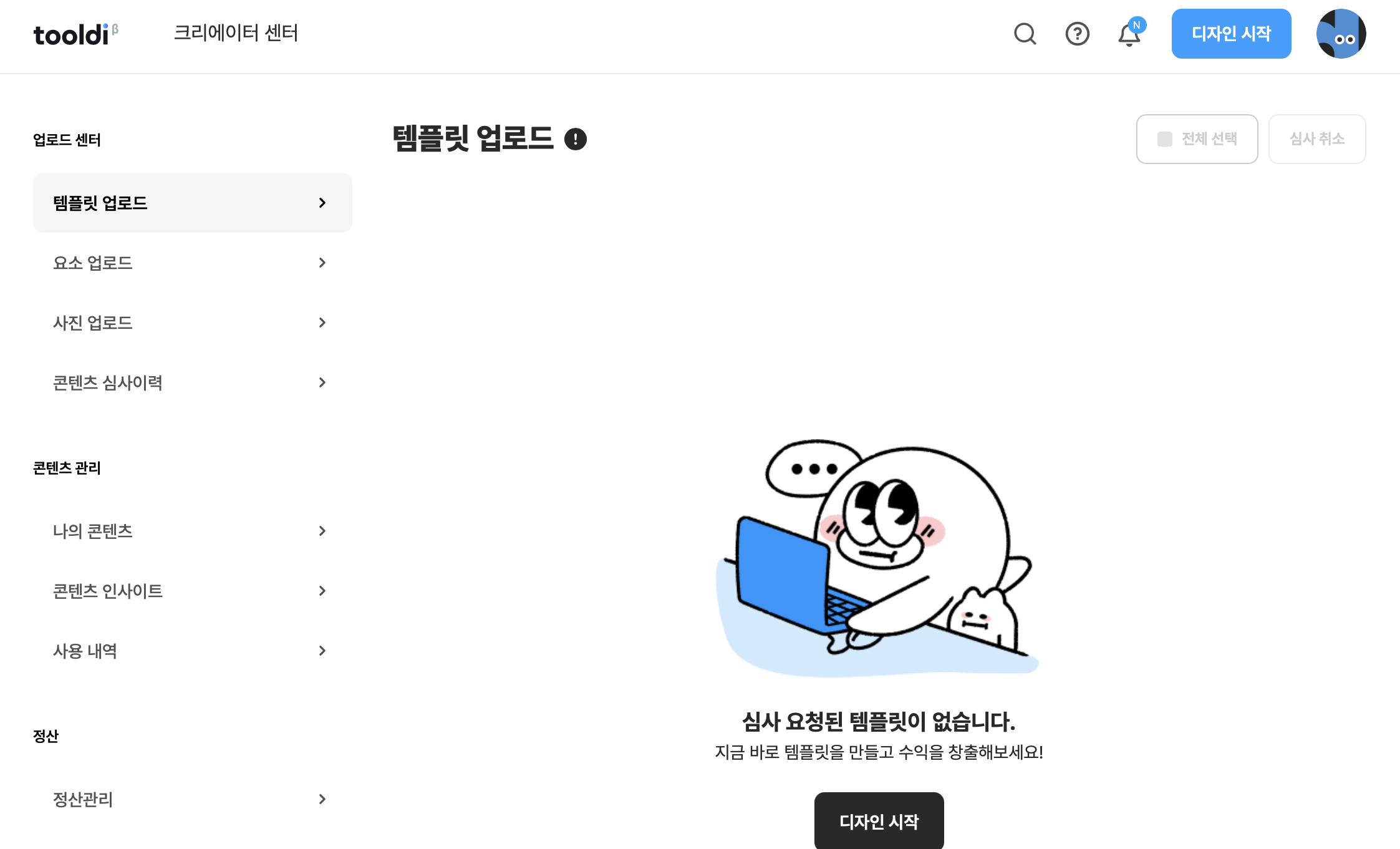 다시 툴디 홈페이지의 첫 화면에서 오른쪽 상단에 개인 프로필 썸네일 부분을 클릭하면 메뉴가 나오는데 그 중에 '크리에이터 센터 바로가기'를 클릭합니다. 크리에이터 센터에서 템플릿, 요소, 사진을 왼쪽 메뉴에 나타난 업로드 센터에 업로드합니다. 업로드 하는 즉시 심사 대기상태가 되며 콘텐츠 심사이력 메뉴에서 승인여부를 볼 수 있습니다.