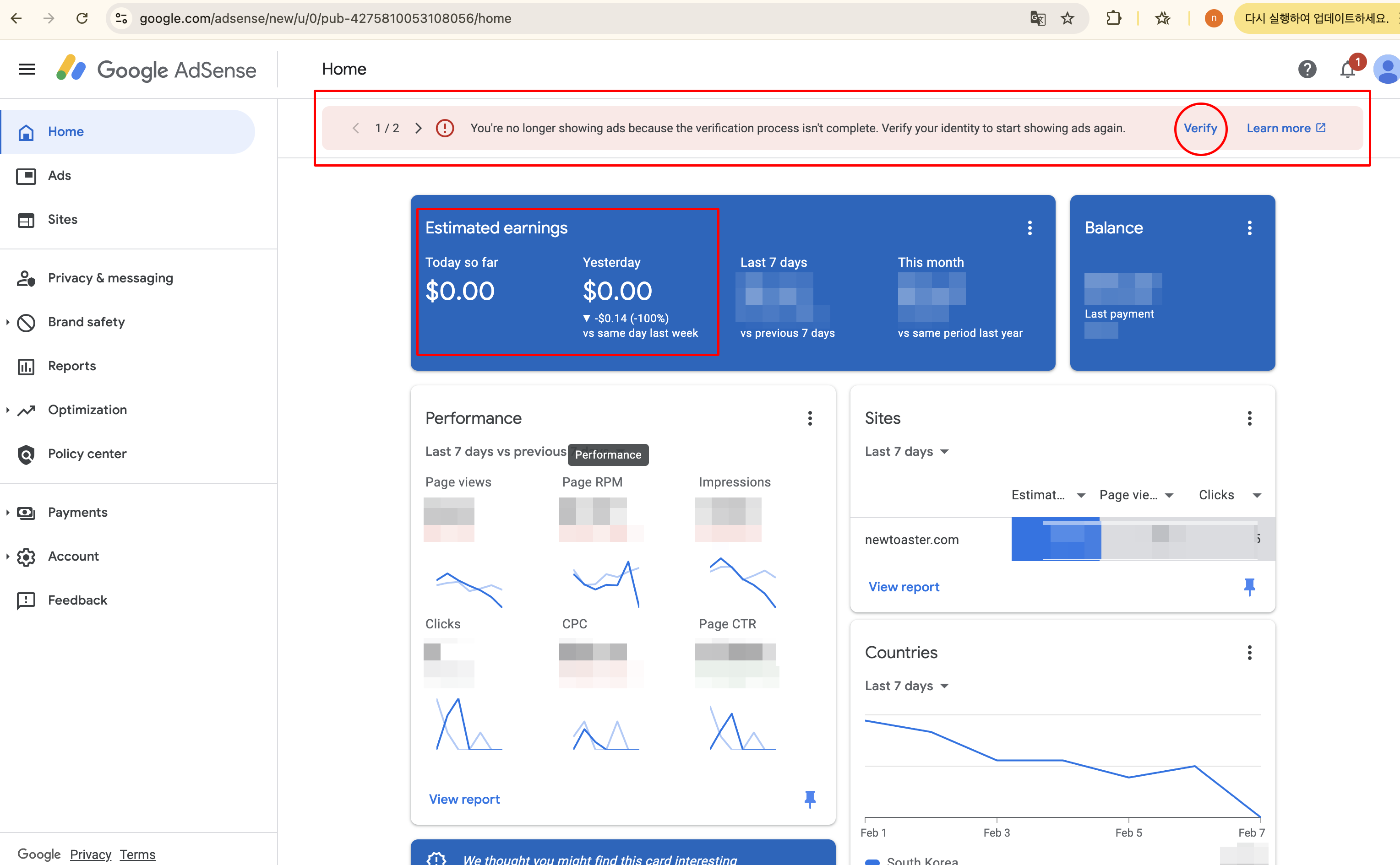 You're no longer showing ads because the verification process isn't complete. verify your identity to start showing ads again. 이 내용을 번역하면 신원 인증 절차가 완료되지 않아서 더이상 광고를 표시하지 않는다는 것이며 광고를 표시하려면 신원을 확인하라는 것이었습니다. 그래서 verify를 클릭했습니다.