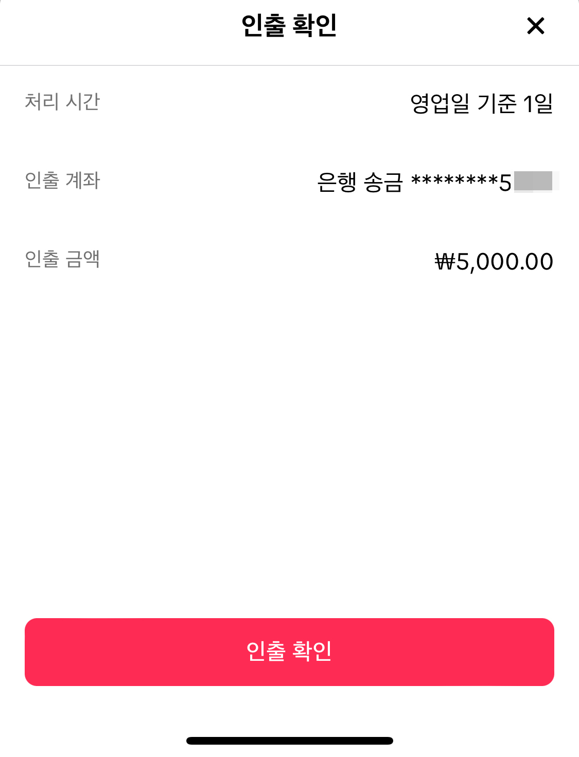 만약 계좌 정보를 한 번도 입력한 적이 없다면 본인 인증과 계좌 정보를 입력해야 합니다. 저는 이전에도 출금한 이력이 있어서 그때 출금한 계좌 정보가 저장되어 있어 더이상 따로 입력하지 않아도 되어서 편리했습니다. 위 내용을 보면 처리 시간이 영업일 기준 1일이라고 되어 있는 것을 볼 수 있습니다. 주말을 제외하면 거의 하루 만에 정산이 된다는 것입니다. 인출 확인 버튼을 누릅니다.