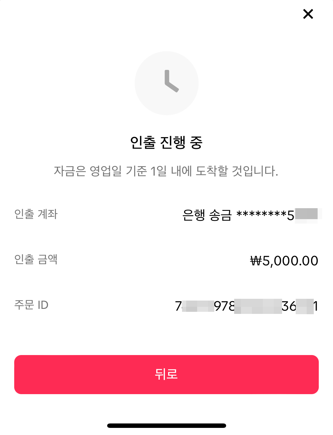 그럼 바로 인출 진행 중 화면이 뜨고, 거의 동시에 바로 입금 처리가 됩니다. 출금이 진짜 감격스럽게 빠릅니다.