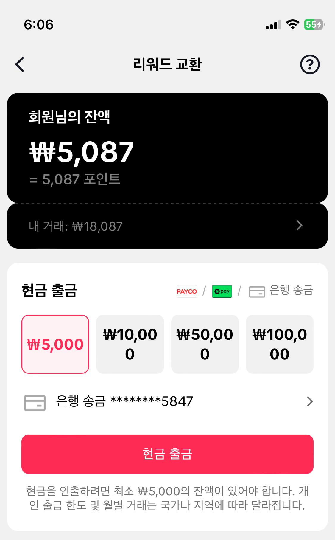 위 이미지는 저의 개인적인 은행 앱에서 계좌를 조회한 화면입니다. 18시 08분에 5,000원이 입금 됐습니다. 출금하면서 화면 캡처를 해두었는데 제가 이번 포스트에 업로드한 위쪽의 이미지들을 보면 시간이 6시 6분으로 (저녁) 되어 있습니다.) 그런데 2분만에 출금 완료가 된 것이고 환상적입니다.