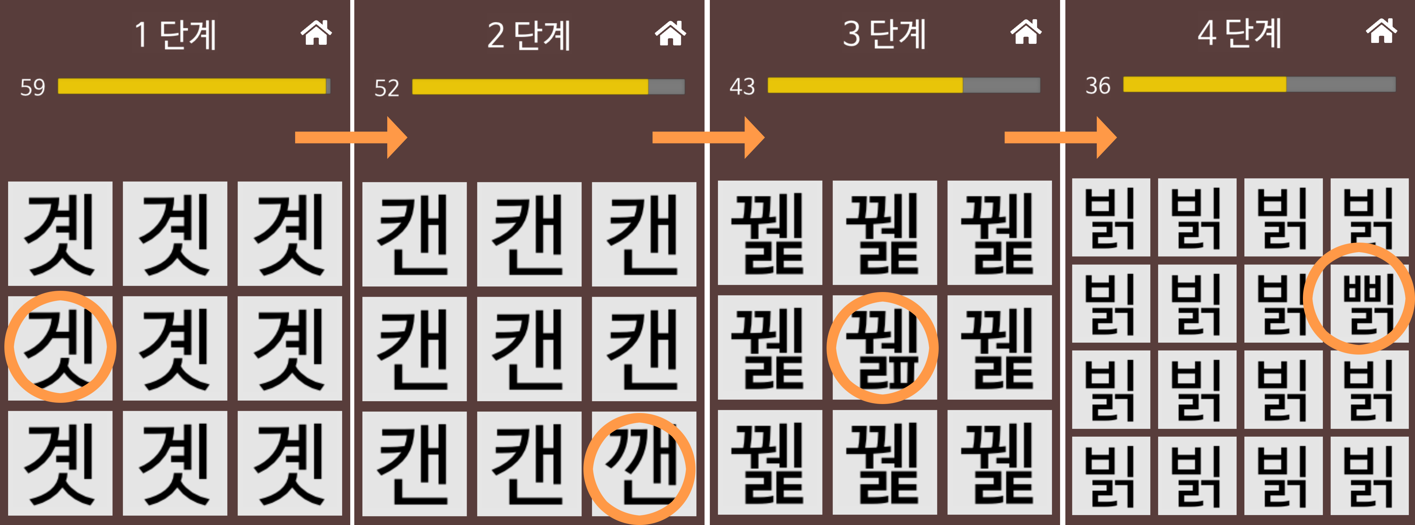 한글을 소재로 했으면서도 한글과는 별로 관련이 없는 눈썰미 테스트 같은 게임 같습니다.