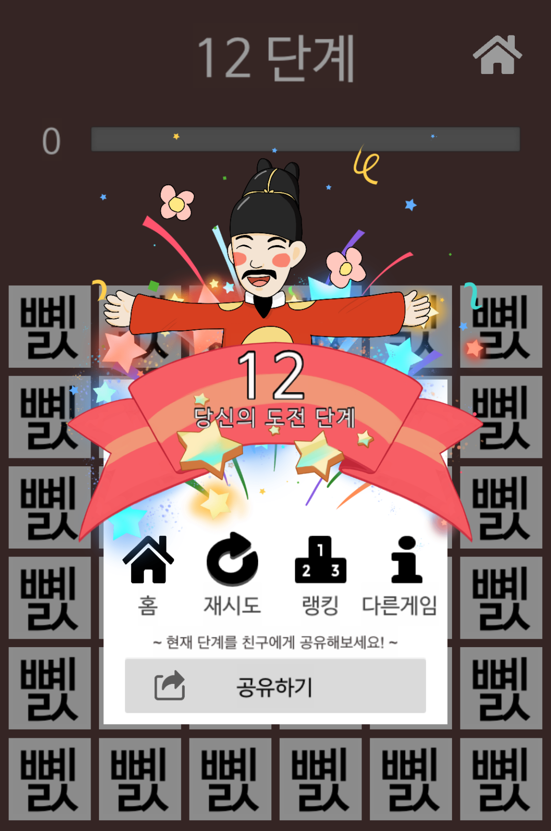 저는 60초 (=1분) 만에 12단계까지를 깼습니다. 이렇게 게임이 끝난 화면에서 랭킹 버튼을 누르면 랭킹을 확인할 수 있습니다.