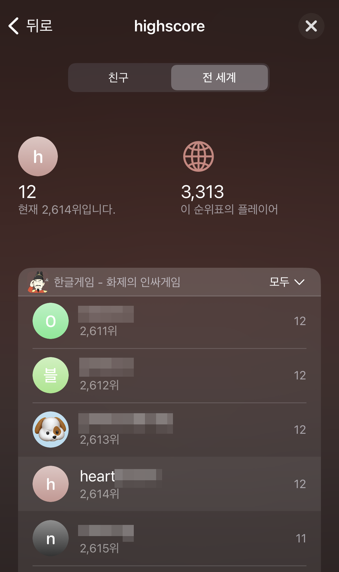 저의 아이디는 heart로 시작하는 아이디입니다. 저는 모든 플레이어들 중에 현제 2,614위입니다. 그리고 아마 12단계까지 깬 유저가 3,313명이라는 것을 표시해주고 있는 것 같습니다. 그리고 자신의 최고 점수로 순위가 저장되어서 좋습니다. 즉 많은 단계의 판을 깬 다음에 다음 게임에서는 게임을 못해도 이전에 세운 최고 기록이 남는 것입니다.
